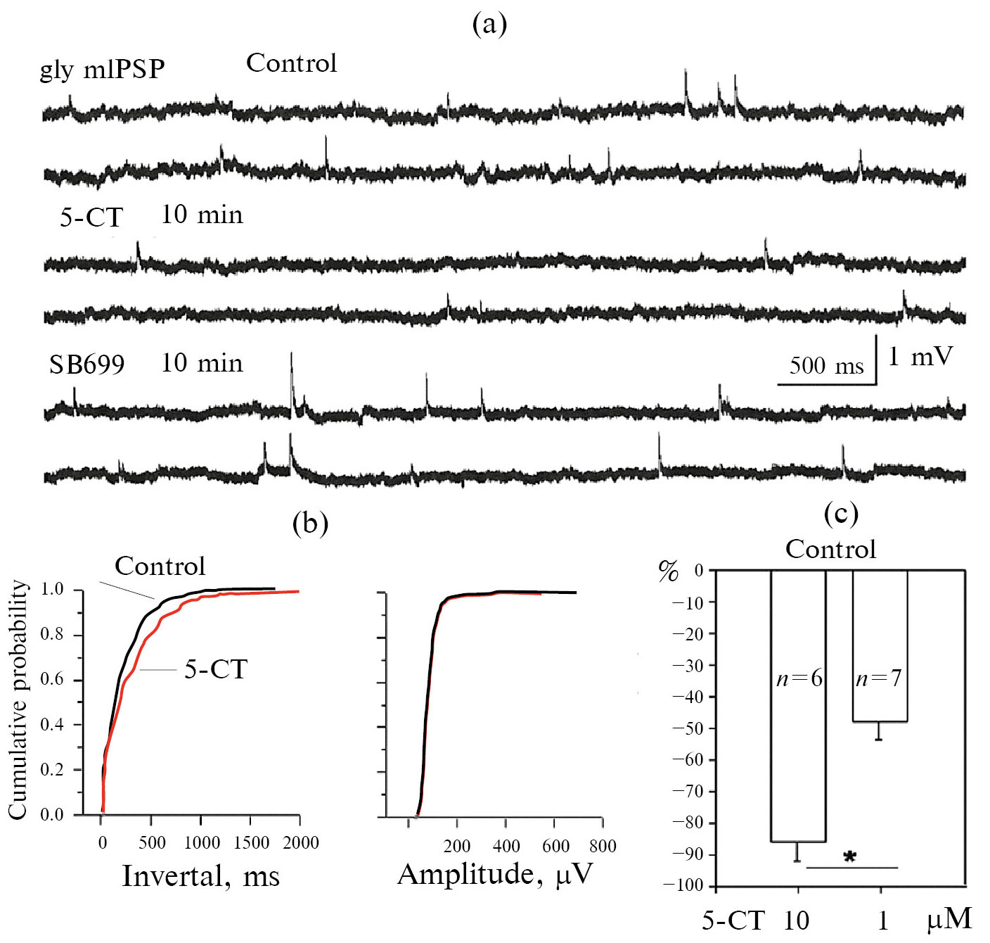 Таким образом, эксперименты с 10 мкМ 5-СТ в растворе свидетельствуют о пре- и постсинаптическом участии 5-HT5AR в подавлении глимТПСП мотонейронов, а меньшая концентрация агониста с последующим введением антагониста SB-69955 о пресинаптическом участии 5-HT5AR в модуляции глициновых миниатюрных событий.