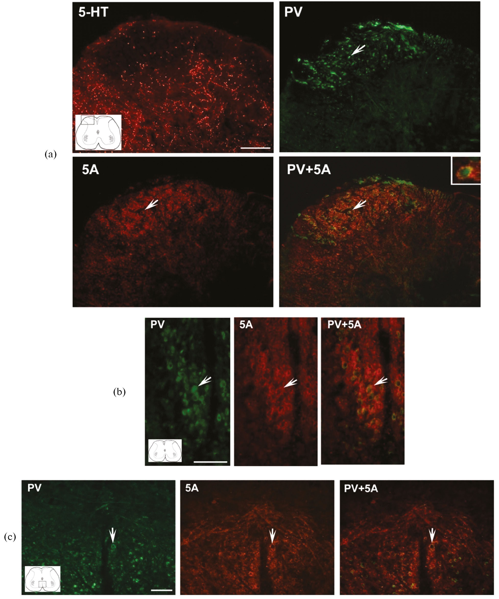 На фронтальных срезах поясничного утолщения с двойным иммуномечением, к 5-НТ5AR и PV, сигнал5-НТ5ARlike+ обнаружен в срезах с большей яркостью в белом веществе. Заметная флуоресценция видна в миелине волокон, идущих в белом веществе дорсальных и вентральных канатиков (рис. 8).