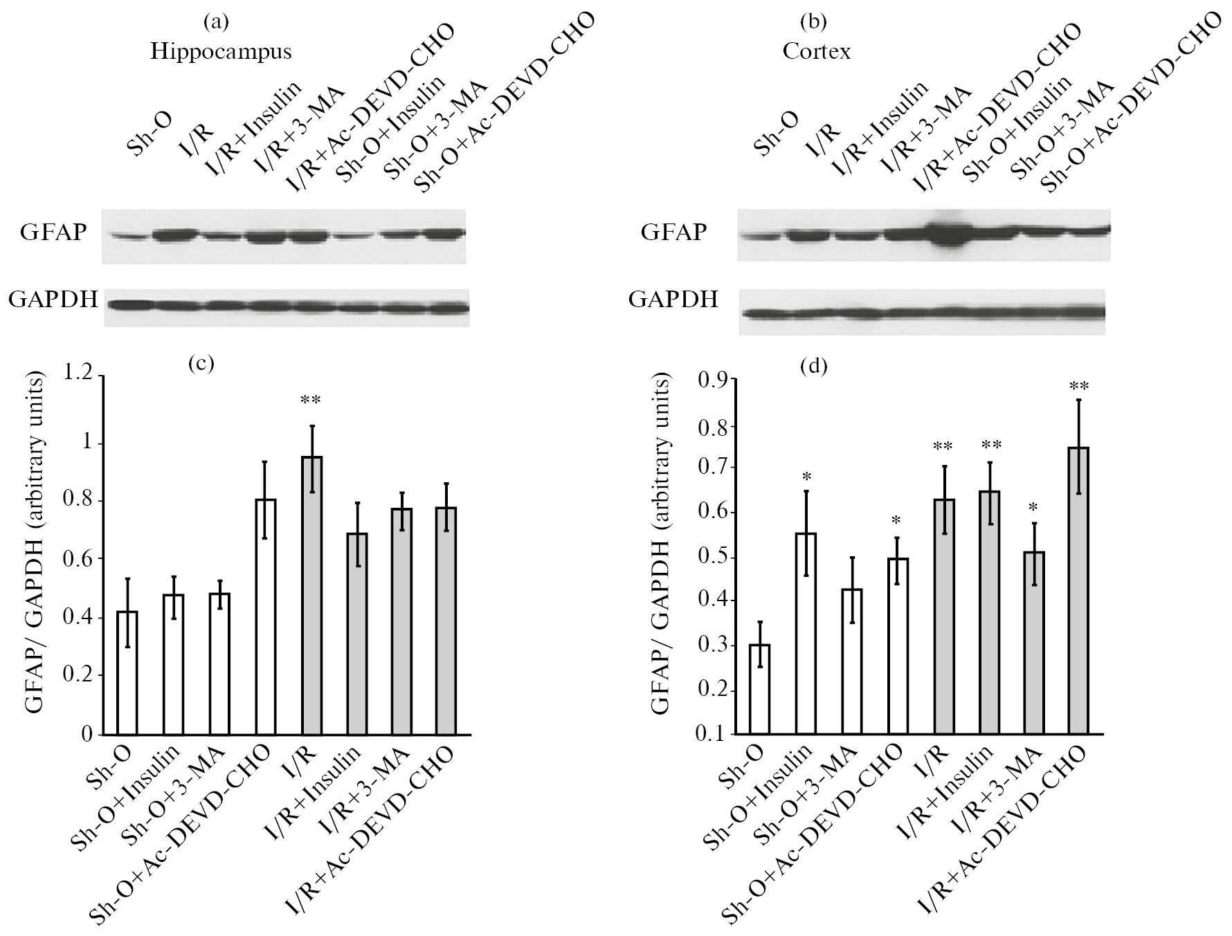 Рис. 3. Влияние введения инсулина и ингибиторов аутофагии и апоптоза (3-MA и aс-DEVD-CHO, соответственно) на уровень глиального кислого фибриллярного белка (GFAP) в гиппокампе и коре мозга при ишемии и реперфузии переднего мозга крыс. Данные показаны как среднее ± SEM из 6–8 опытов. (a) и (c) – уровень GFAP в гиппокампе, (b) и (d) – уровень GFAP в лобной коре, (a) и (b) – иммуноблотты, (c) и (d) – результаты денситометрии представлены как GFAP/GAPDH. Расшифровка сокращений на рисунке и другая информация приведены в легенде к рис. 1. Различия достоверны по t критерию Стьюдента по сравнению с данными, полученными в том же районе мозга ложно-оперированных крыс: * – p <0.05, ** – p<0.02.