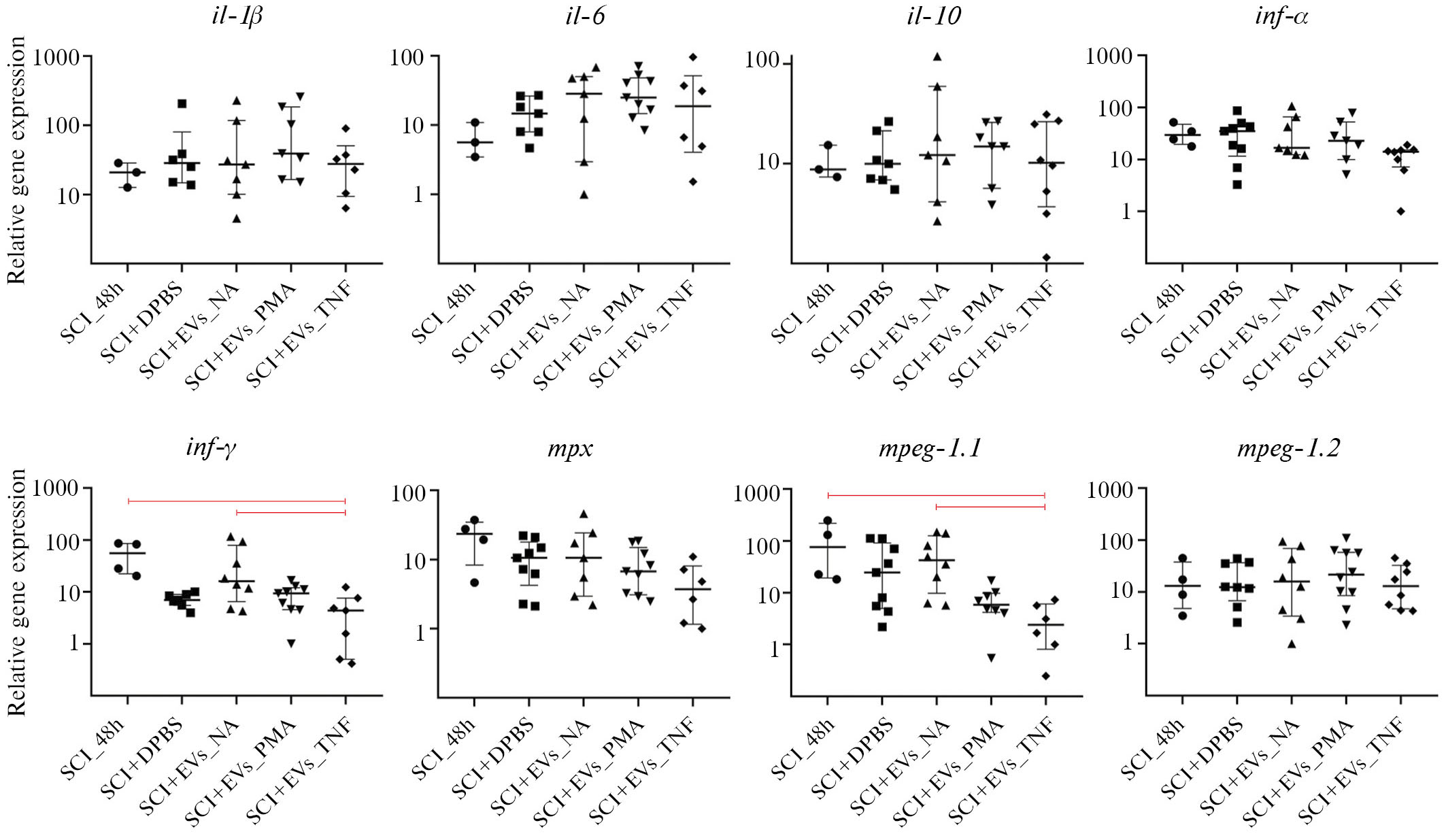 Рис. 4. Относительная экспрессия генов il‑1β, il‑6, il‑10, tnf-α, ifn-γ, mpx, mpeg‑1.1, mpeg‑1.2 в тканях мозга рыб Danio rerio с функционально подтвержденной травмой спинного мозга и введением внеклеточных везикул.