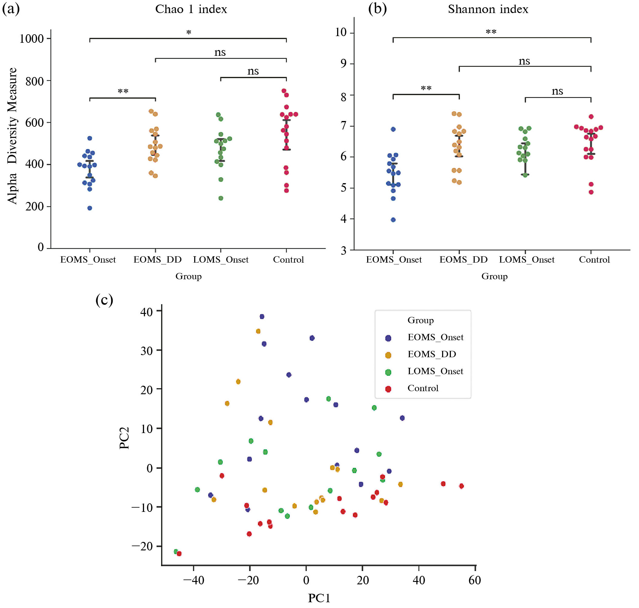 Для описания структуры кишечного микробиома используются характеристики альфа- и бета-разнообразия, отражающие видовое богатство в сообществе и межиндивидуальные различия, соответственно. Сравнение альфа-разнообразия (индексы Шеннона и Чао 1) кишечного микробиома исследуемой выборки выявило более низкие значения обоих индексов в группе EOMS_Onset по сравнению с контрольной группой и с группой EOMS_DD (рис. 1а), а анализ бета-разнообразия – показал высокую межиндивидуальную вариабельность, особенно среди пациентов с РС (рис. 1b).