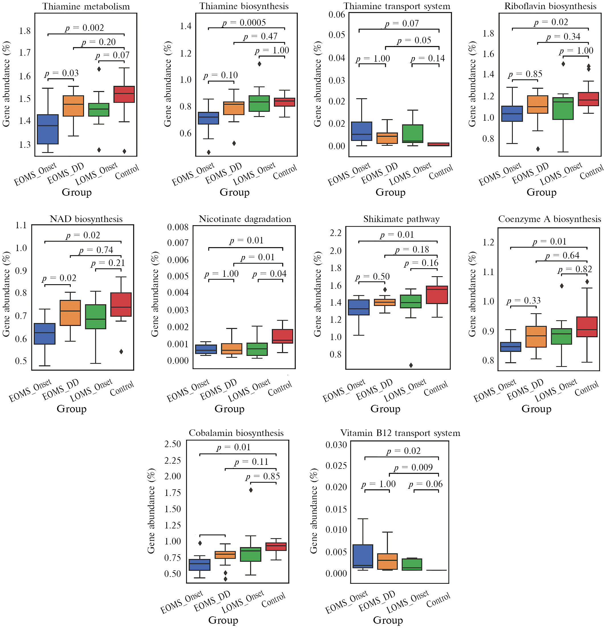 Рис. 6. Изменения потенциальной представленности бактериальных генов, вовлекаемых в пути метаболизма, синтеза и транспорта витаминов группы В. Данные представлены как медиана, границы прямоугольников – 1–3 квартили, границы отрезков – 95% доверительный интервал. Для сравнения использовали двусторонний тест Манна–Уитни с поправкой Бонферрони на множественность сравнений.