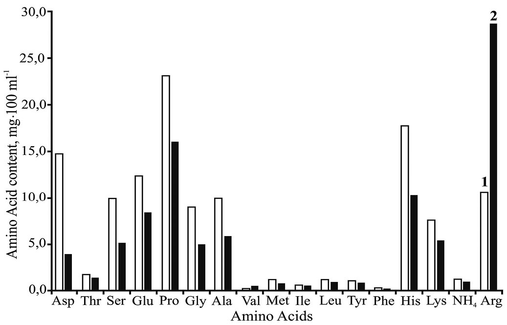 Рис. 1. Содержание свободных аминокислот в гемолимфе анадары Anadara kagoshimensis при нормоксии (1) и гипоксии (2). Примечание. Глутамин и аспарагин в процессе разделения в кислой среде разлагаются на глутаминовую и аспарагиновую кислоты, поэтому на хроматограмме появляется пик аммиака (см. рис. 1, 2, 3).