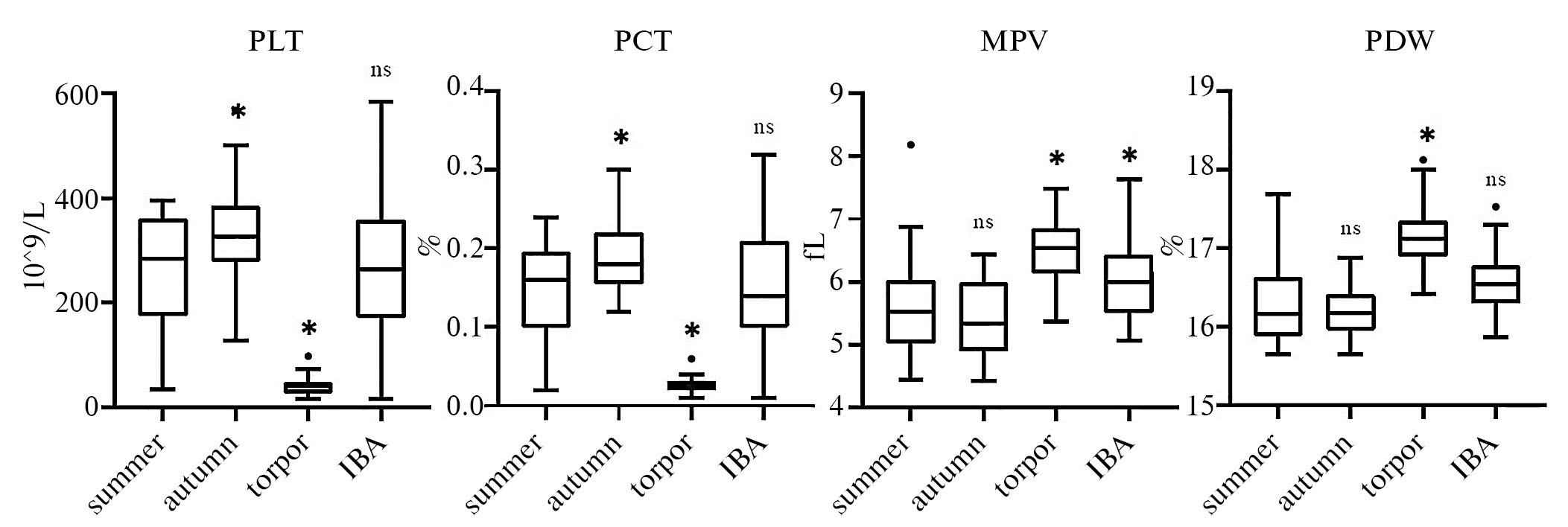 Рис. 4. Сезонные изменения тромбоцитов в периферической крови сусликов U. undulatus (n = 25 для каждого времени года). Значения представлены в виде диаграммы размаха (box plot), где ● – выбросы, * – статистически значимые различия между группами (p <0.05), ns – по результатам статистической проверки достоверных отличий не обнаружено (р ≥0.05). PLT – количество тромбоцитов; PCT – тромбокрит; MPV – средний объем тромбоцитов; PDW – ширина распределения тромбоцитов по объему.