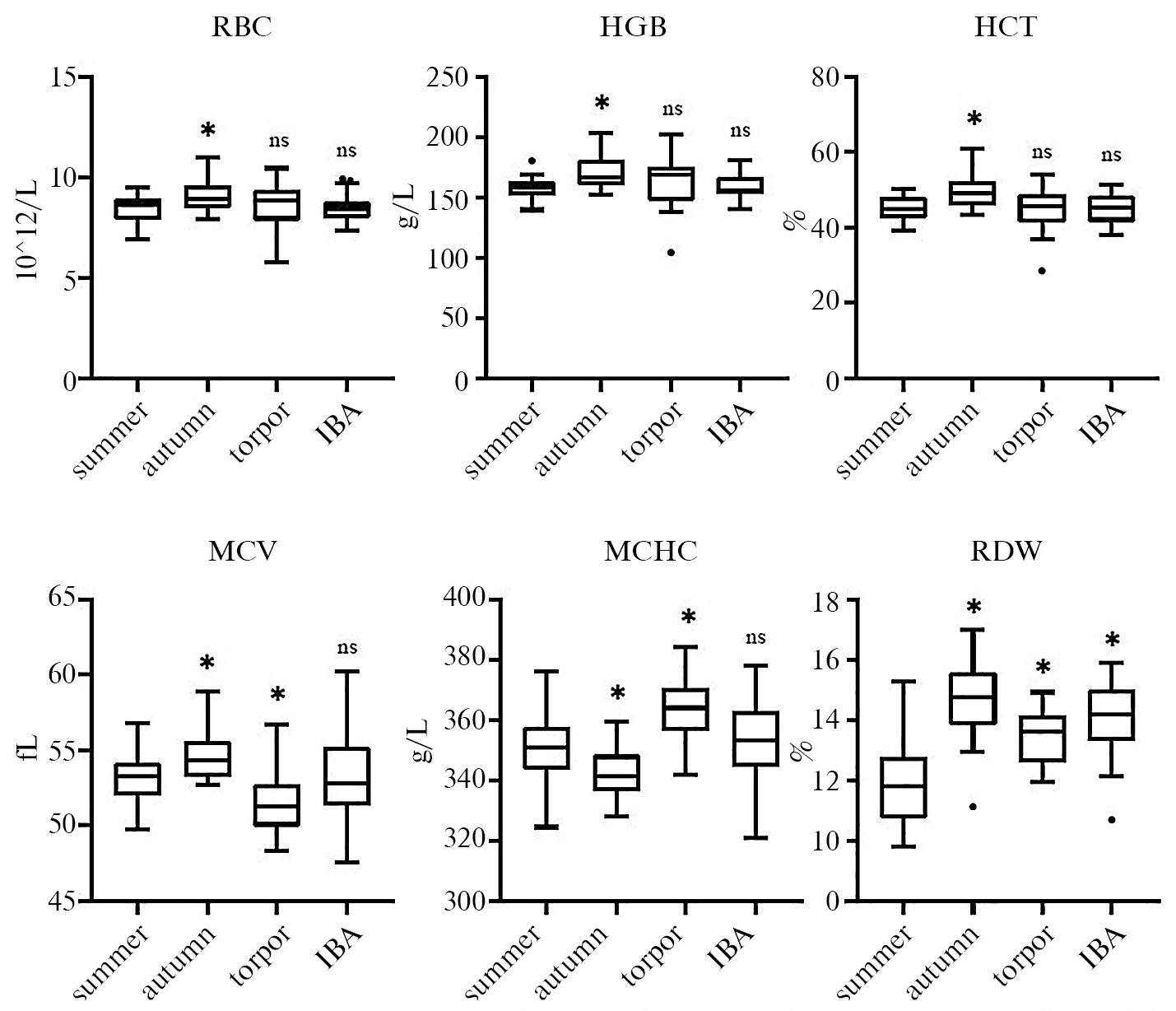 Рис. 5. Сезонные изменения эритроцитарных показателей в периферической крови сусликов U. undulatus (n = 25 для каждого времени года). Значения представлены в виде диаграммы размаха (box plot), где ● – выбросы, * – статистически значимые различия между группами (p <0.05), ns – по результатам статистической проверки достоверных отличий не обнаружено (р ≥0.05). RBC – эритроциты; HGB – концентрация гемоглобина; HCT – гематокрит; MCV – средний объем эритроцита; MCHC – средняя концентрация гемоглобина в эритроците; RDW – ширина распределения эритроцитов.