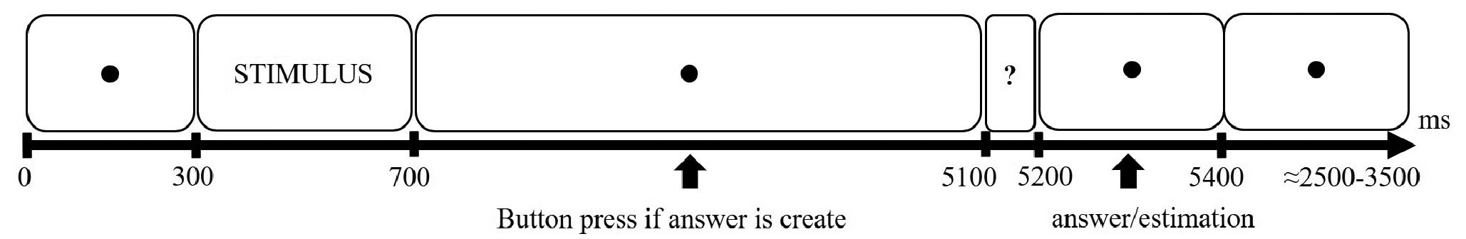 Общая схема выполнения заданий в парадигме вызванных потенциалов. Все творческие и контрольные задания выполнялись в виде отдельных проб (рис. 1). На 300-й мс от начала каждой пробы предъявлялся текстовый стимул (пословица, тройка слов, словесное обозначение объекта/категории), длительность экспозиции которого составляла 400 мс. Слова в пословицах, тройки слов предъявлялись друг под другом (в две, три строки), чтобы уменьшить количество горизонтальных движений глаз во время чтения задания и создать сопоставимый зрительный паттерн при восприятии стимулов. Стимул сменялся точкой в центре экрана для фиксации взгляда. После предъявления стимула испытуемый (согласно инструкции) должен был найти ответ, мысленно его проговорить и нажать на кнопку мыши пальцем правой руки. Инструкция мысленной вербализации ответа была введена для уменьшения количества “ложных нажатий”, когда испытуемый обозначает наличие ответа, но затем не в состоянии его озвучить. Подобные пробы были единичными и исключались из последующего анализа ВП. Если ответ не был найден – нажимать на кнопку было не надо. На 5100 мс предъявлялся знак вопроса (“?”) длительностью предъявления 100 мс. После предъявления вопроса испытуемые должны были озвучить вслух свой ответ или сказать “нет”, если ответ не был найден. Длительность интервала между пробами варьировала в пределах от 1500 до 2500 мс.