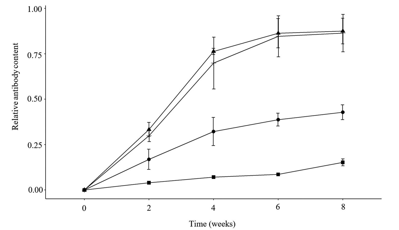 Анализ содержания специфических антител к sfGFP в сыворотках иммунизированных мышей осуществляли согласно разработанному нами ранее протоколу иммуноферментного анализа (ИФА) [24]. В лунки 96-луночного планшета вносили раствор глутарового альдегида. Инкубировали 1 ч, затем в лунки вносили по 100 мкл раствора sfGFP. Спустя 1 ч вносили раствор обезжиренного молока с добавлением 0.5 % Tween 20. Далее в лунки планшета вносили сыворотки мышей, через 1 ч – специфические антитела, конъюгированные с пероксидазой хрена. Спустя еще 1 ч – проявитель и измеряли поглощение в лунках планшета при длине волны 450 нм с помощью мультимодального ридера. При выполнении ИФА внутри одного периода иммунизации (2, 4, 6 или 8 неделя) брались одинаковые разведения мышиных сывороток. В частности, разведение для срока 2 недели составляло 1/125, для срока 4 недели – 1/250, для срока 6 недель – 1/1000, для срока 8 недель – 1/2000. Концентрацию белка измеряли на спектрофотометре NanoDrop 2000 (Thermo Scientific, США). Измерение производили в капле жидкости (2 мкл). Относительное содержание антител в экспериментальных группах определяли путем отнесения оптической плотности, измеренной в образцах экспериментальных групп, к оптической плотности в образцах соответствующих контрольных групп.