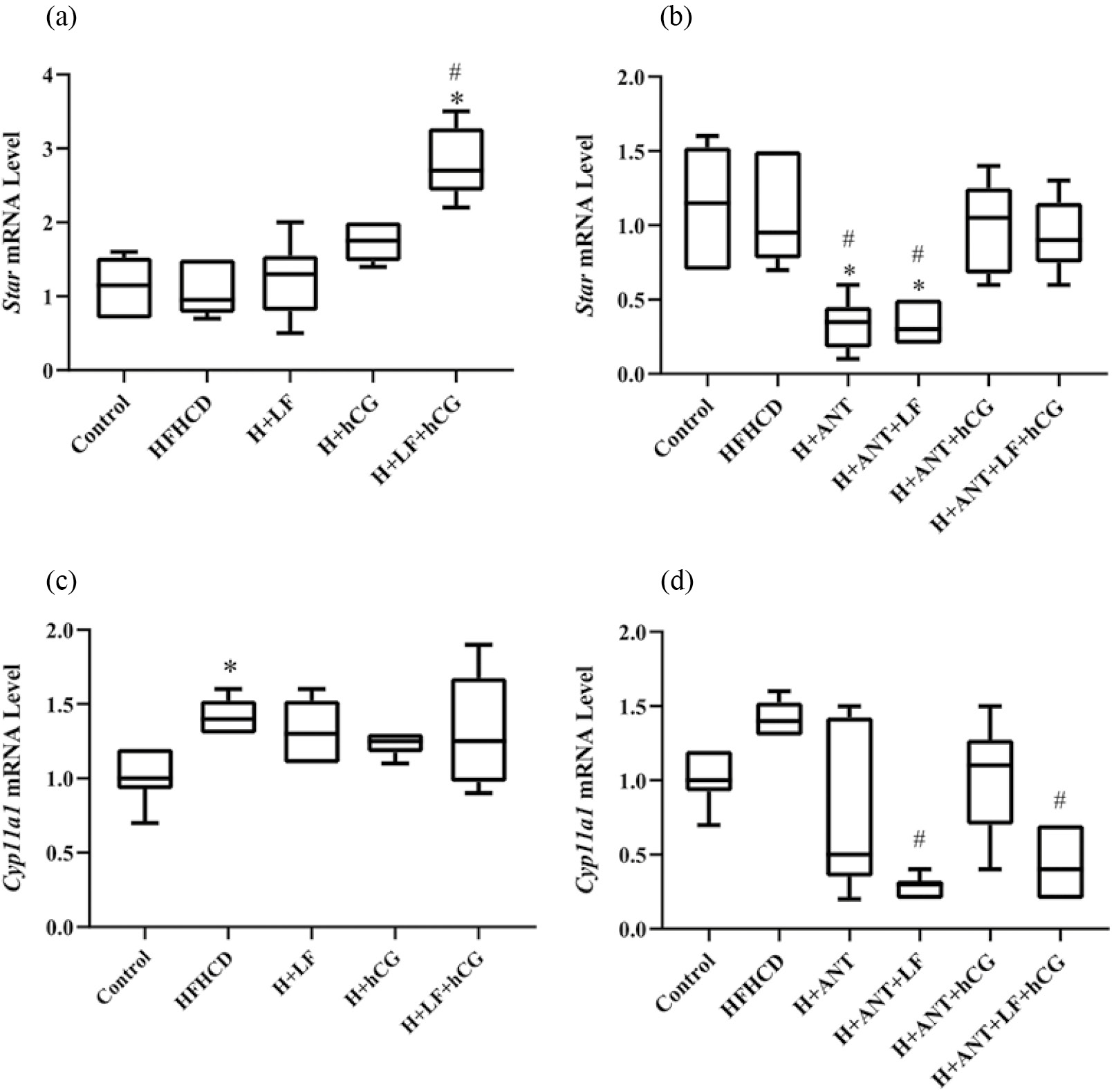 Образцы тканей семенников были взяты через 270 мин после введения ФЛ и/или АНТ и через 180 мин после введения ХГЧ. (a) – Уровни мРНК гена Star в семенниках ВЖВУД-крыс, которым в течение трех дней интраназально вводили ФЛ в дозе 200 мкг/кг (H+LF и H+LF+hCG – группы “ ВЖВУД+ФЛ” и “ВЖВУД+ФЛ+ХГЧ”) и однократно, подкожно вводили ХГЧ в дозе 15 МЕ/крысу (H+hCG и H+LF+hCG – группы “ВЖВУД+ХГЧ” и “ВЖВУД+ФЛ+ХГЧ”). (b) – Уровни мРНК гена Star в семенниках ВЖВУД-крыс, которым в течение трех дней вводили АНТ в дозе 75 мкг/кг (подкожно) и/или ФЛ в дозе 200 мкг/кг (интраназально) (H+ANT – группа “ВЖВУД+АНТ”, H+ANT+LF – группа “ВЖВУД+АНТ+ФЛ”, H+ANT+hCG – группа “ВЖВУД+АНТ+ХГЧ”, H+ANT+LF+hCG – группа “ВЖВУД+АНТ+ФЛ+ХГЧ”) и однократно, подкожно вводили ХГЧ в дозе 15 МЕ/крысу (H+ANT+hCG и H+ANT+LF+hCG). (c) и (d) – Уровни мРНК гена Cyp11a1 в семенниках ДИО- крыс на фоне введения ФЛ, АНТ, ХГЧ или их комбинаций. Препараты вводили как описано выше. Данные представлены как медиана, максимальное и минимальное значение, n = 6 в каждой группе. * – отличия от группы “Контроль” (Control), # – отличия от группы “ВЖВУД” (HFHCD) статистически значимы при p < 0.05.