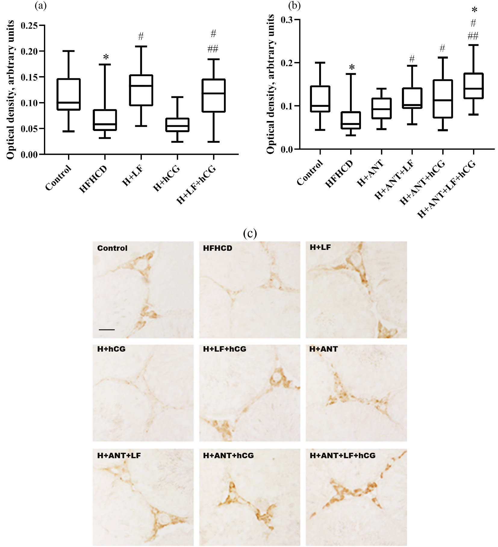 Образцы тканей семенников были взяты через 270 мин после введения ФЛ и/или АНТ и через 180 мин после введения ХГЧ. (а) – Содержание рецептора ЛГ в семенниках ДИО-крыс, которым в течение трех дней интраназально вводили ФЛ в дозе 200 мкг/кг (H+LF и H+LF+hCG – группы “ ВЖВУД+ФЛ” и “ВЖВУД+ФЛ+ХГЧ”) и однократно, подкожно вводили ХГЧ в дозе 15 МЕ/крысу (H+hCG и H+LF+hCG – группы “ВЖВУД+ХГЧ” и “ ВЖВУД+ФЛ+ХГЧ”). (b) – Содержание рецептора ЛГ в семенниках ДИО-крыс, которым в течение трех дней вводили АНТ в дозе 75 мкг/кг (подкожно) и/или ФЛ в дозе 200 мкг/кг (интраназально) (H+ANT – группа “ВЖВУД+АНТ”, H+ANT+LF – группа “ ВЖВУД+АНТ+ФЛ”, H+ANT+hCG – группа “ВЖВУД+АНТ+ХГЧ”, H+ANT+LF+hCG – группа “ВЖВУД+АНТ+ФЛ+ХГЧ”) и однократно, подкожно вводили ХГЧ в дозе 15 МЕ/крысу (H+ANT+hCG и H+ANT+LF+hCG). (c) – Иммуногистохимическая реакция к рецептору ЛГ в семенниках ДИО-крыс. Масштаб на всех изображениях: 50 мкм. Данные представлены как медиана, максимальное и минимальное значение, n = 6 в каждой группе. * – отличия от группы “Контроль” (Control), # – отличия от группы “ВЖВУД” (HFHCD), ## – отличия от группы “ВЖВУД+АНТ+ХГЧ” (H+ANT+hCG) статистически значимы при p < 0.05.