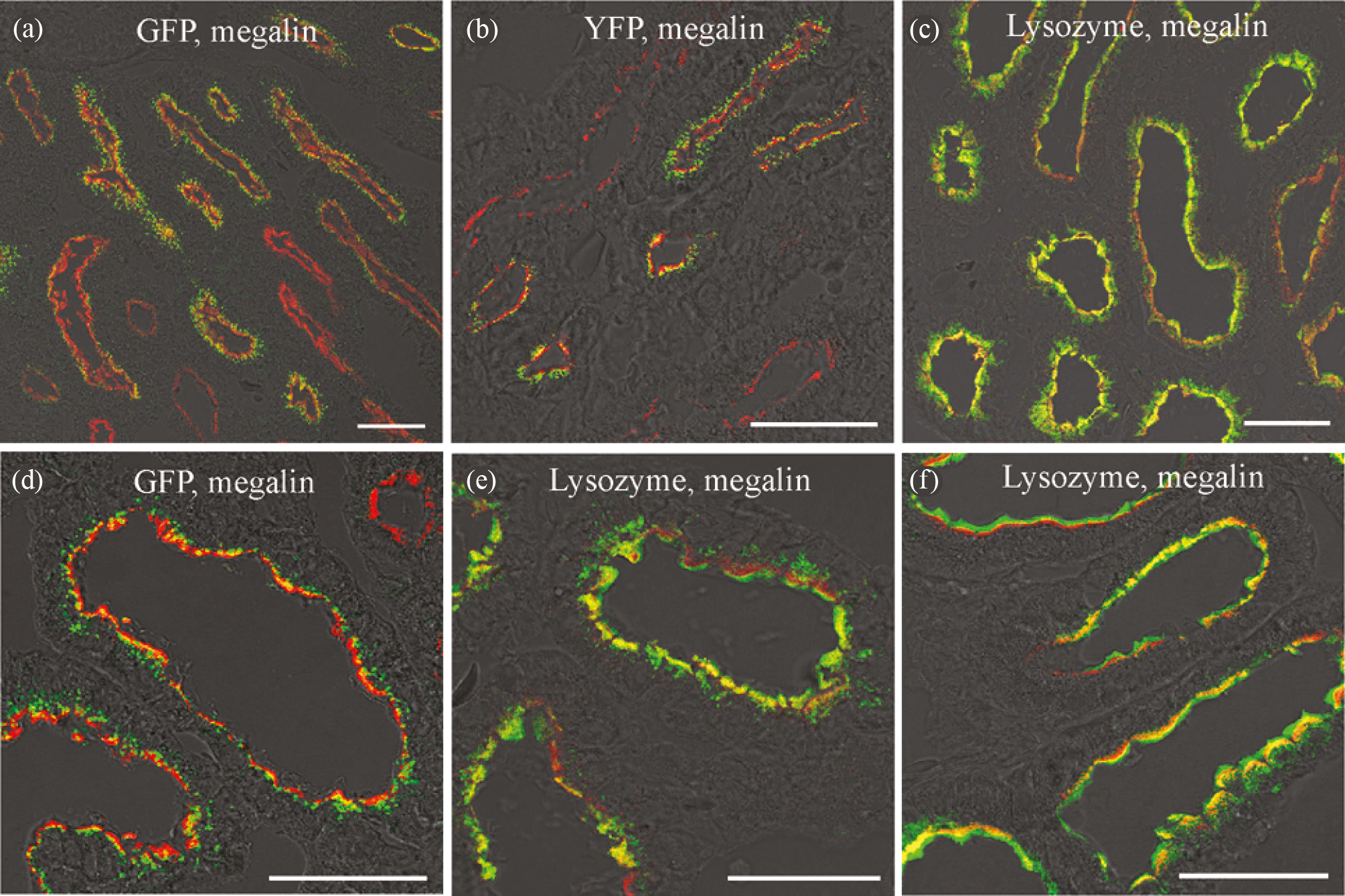 Образцы ткани почек фиксировали в 4 % растворе параформальдегида и обрабатывали, как описано ранее [13]. Срезы (толщиной 5–7 мкм) из разных частей почки получали в криостате CM 1510 (Leica Microsystems, Germany). В иммуногистохимических исследованиях применяли кроличьи поликлональные антитела к лизоциму (Abcam, США) в разведении 1:200 и мышиные моноклональные антитела к мегалину/LRP2 (MyBioSourse, США; Acris, Origene Technologies, США) в разведении 1:1000, а также флуоресцентные конъюгаты козьих антикроличьих и обезьяньих антимышиных иммуноглобулинов (IgGs) c Alexa Fluor 488 и Alexa Fluor 568 в разведении 1:500 (Invitrogen, Molucular Probes, США), согласно описанному ранее протоколу [11]. Срезы монтировали на предметные стекла, заключали в мовиол и изучали в конфокальном микроскопе DMI 6000 с лазерной приставкой Leica SP II (Leica Microsystems, Германия), используя объектив 40x. В режиме лазерного сканирования использовали спектры возбуждения с длинами волн 488, 513 и 568 нм, регистрируя в различных частях спектра свечение Alexa Fluor 488 и GFP (500–520 нм), YFP (515–550 нм) и Alexa Fluor 568 (590–650 нм), соответственно. Последовательное сканирование в этих каналах и проходящем свете осуществляли при одних и тех же настройках микроскопа.