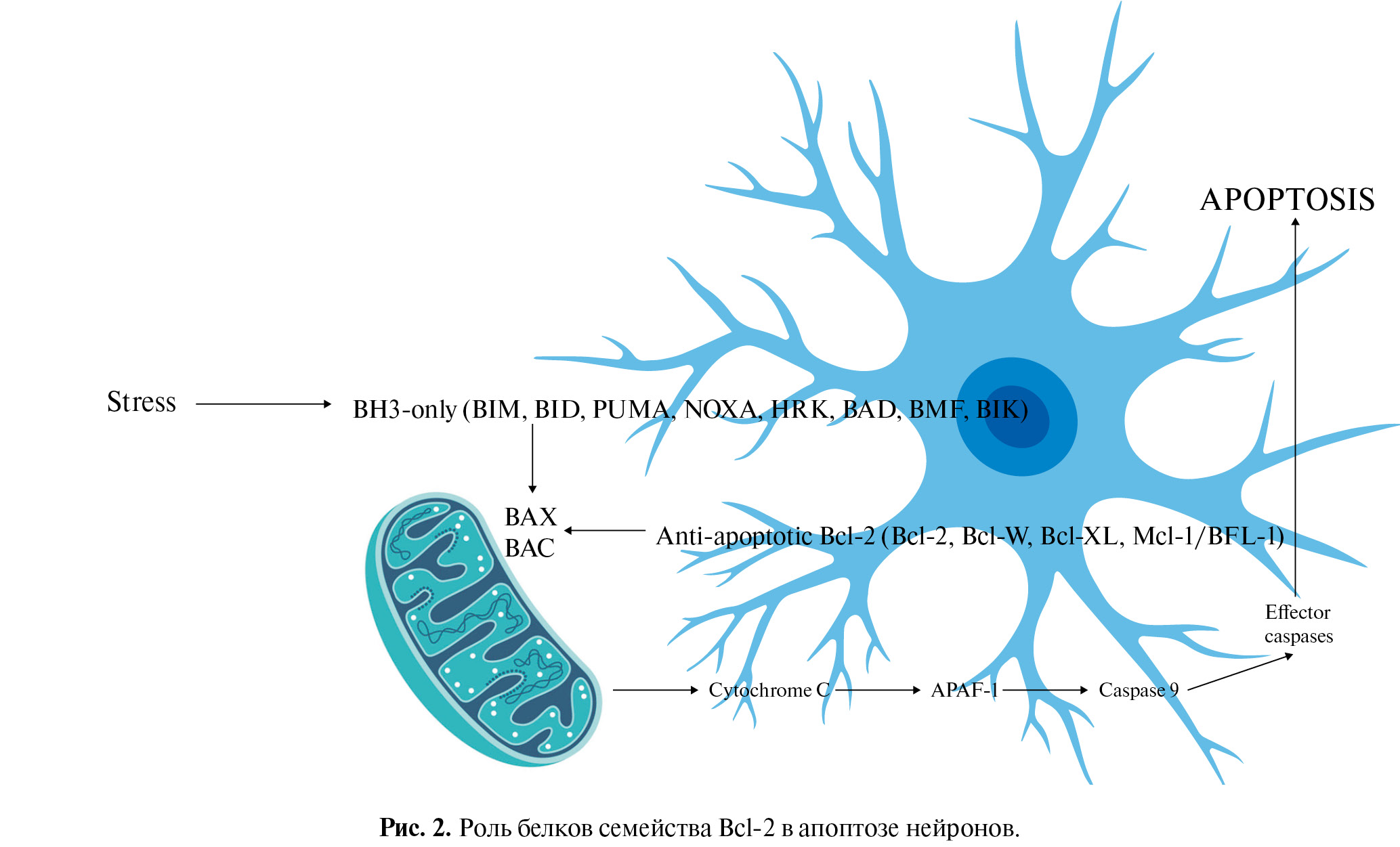 Рис. 2. Роль белков семейства Bcl-2 в апоптозе нейронов.