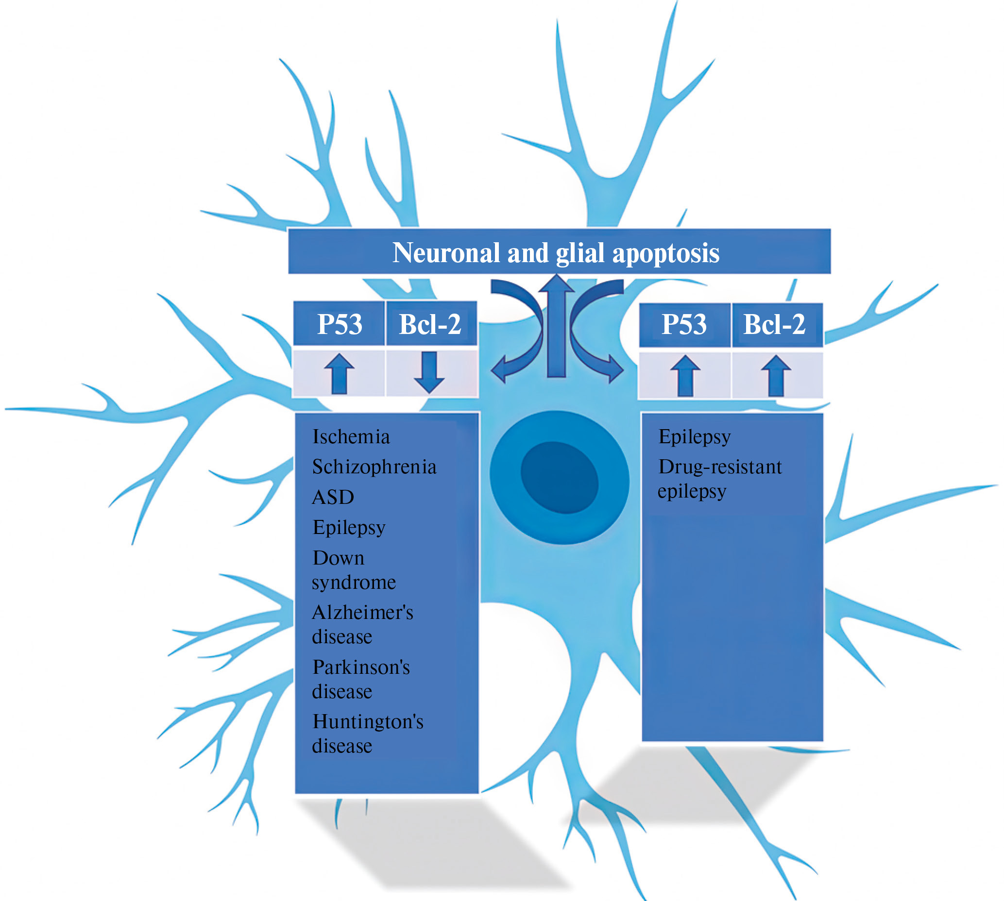 Анализ литературы позволяет предположить, что Bcl-2 не играет в головном мозге столь значимой роли, и его экспрессия снижается в процессе онтогенеза, в отличие от периферической нервной системы. При многих заболеваниях (шизофрения, расстройства аутистического спектра, нейродегенеративные заболевания и др.) отмечено снижение уровня экспрессии Bcl-2 (рис. 3). При эпилепсии же многие авторы наблюдают повышение уровней Bcl-2 как в мозге, так и в сыворотке крови и спинномозговой жидкости (рис. 3). Таким образом, можно предположить, что белок Bcl-2 как терапевтическая мишень менее перспективен, чем р53.