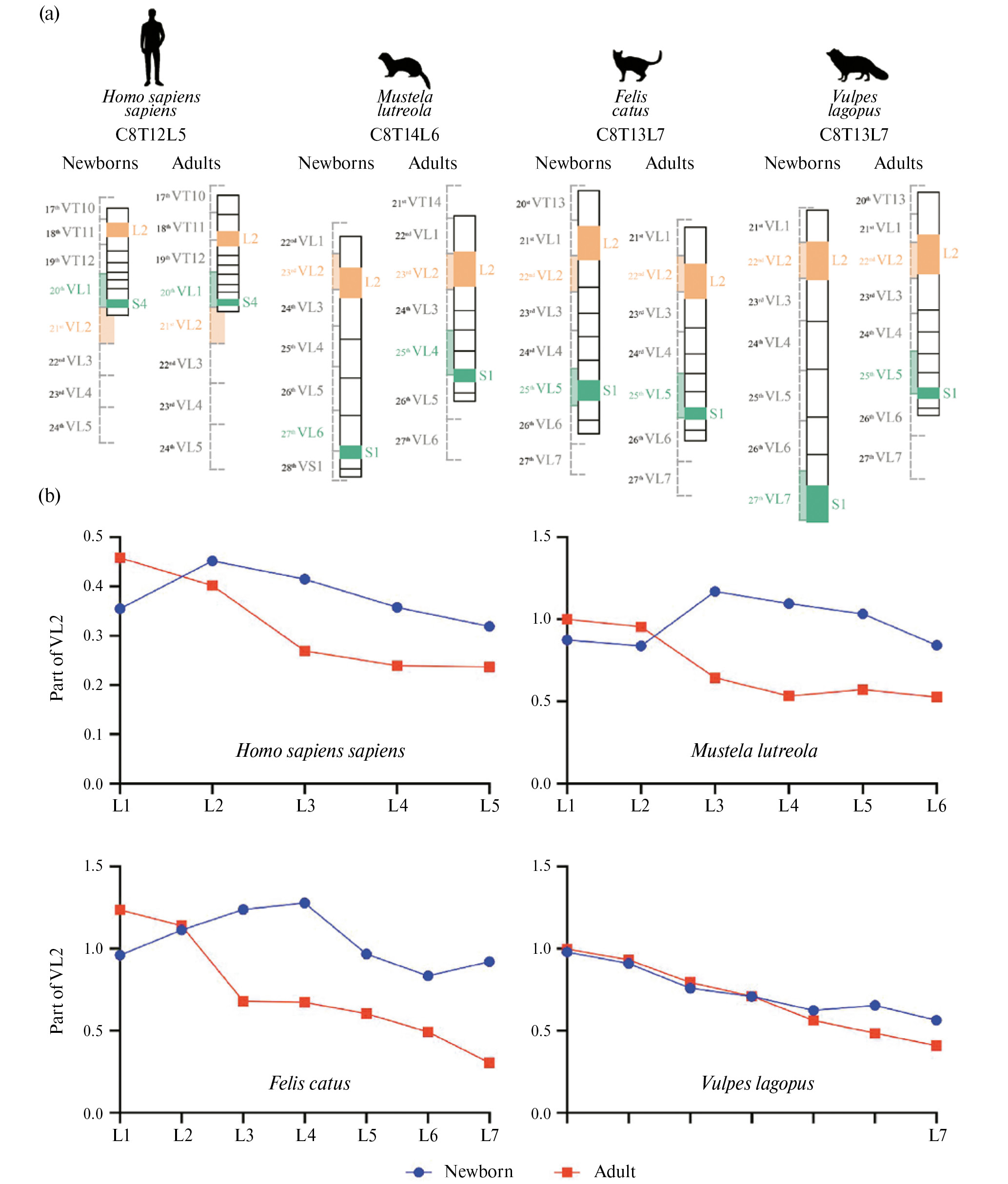 Рис. 3. Скелетотопия (a) и относительная длина (b) сегментов поясничного отдела спинного мозга новорожденных (newborn) и взрослых (adult) животных. На (а) для каждого вида указано число шейных, грудных и поясничных сегментов; слева пунктиром обозначены позвонки с нумерацией их по отделам и непрерывной нумерацией, начиная от первого шейного; светло-зелёным обозначен позвонок, в котором находится 29-й сегмент спинного мозга. Масштаб выбран так, чтобы длина позвонка VL2 (обозначен светло-оранжевым), используемого для нормировки, была одинаковой для всех видов. Черными прямоугольниками обозначены сегменты спинного мозга, сегмент L2 обозначен ярко-оранжевым, а 29-й сегмент – яркозелёным. На (b): отношение длин поясничных сегментов к длине позвонка VL2 у новорожденных и взрослых животных. L – поясничный сегмент, part of VL2 – доля от длины позвонка VL2.