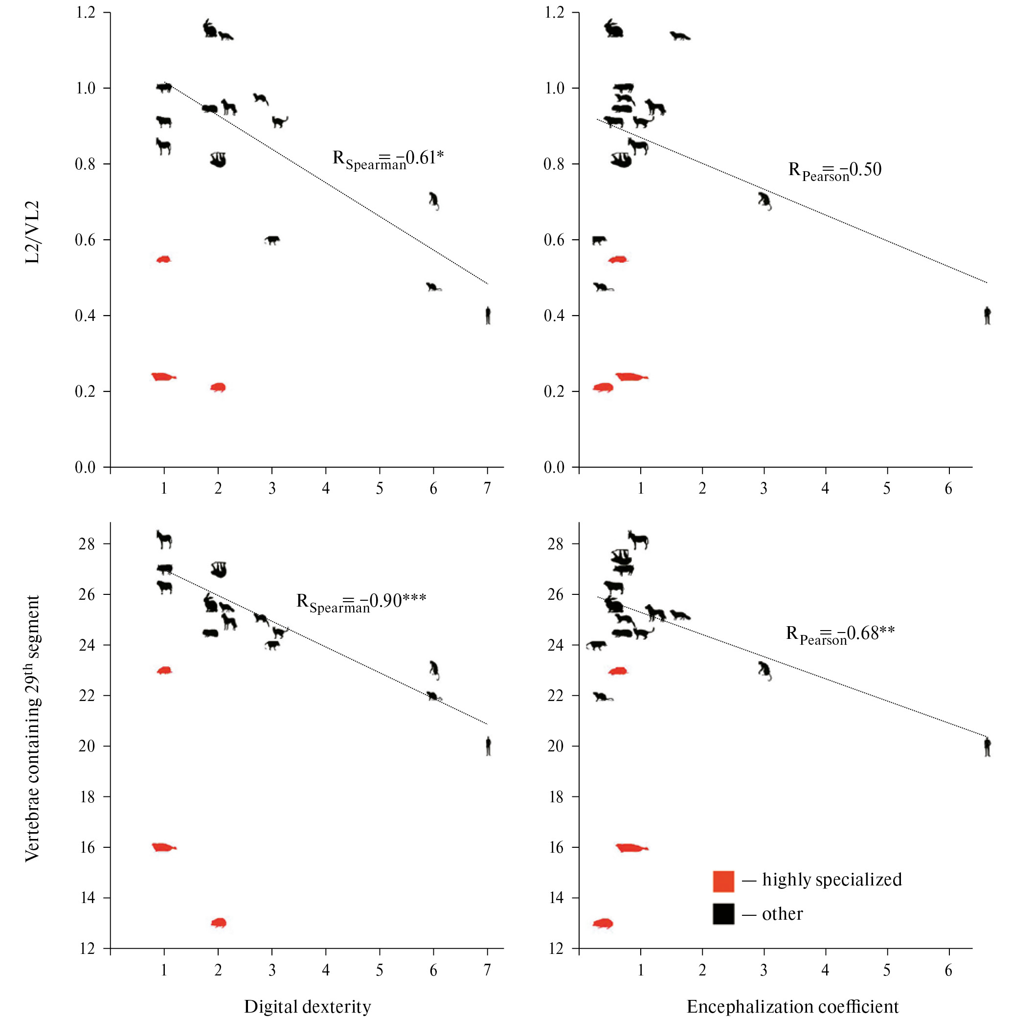 Рис. 4. Связь параметров восхождения (относительной длины сегмента L2 (L2/VL2) и номера позвонка, содержащего 29-й сегмент спинного мозга, (vertebrae containing 29ʰᵗ segment)) с ловкостью пальцев (digital dexterity) и коэффициентом энцефализации (encephalization coefficient). Highly specialized – высокоспециализированные, other – не высокоспециализированные (прочие) виды. RSpearman, RPearson – значения коэффициента корреляции Спирмена и Пирсона, соответственно. * – p < 0.05, ** – p < 0.01, *** – p < 0.001.