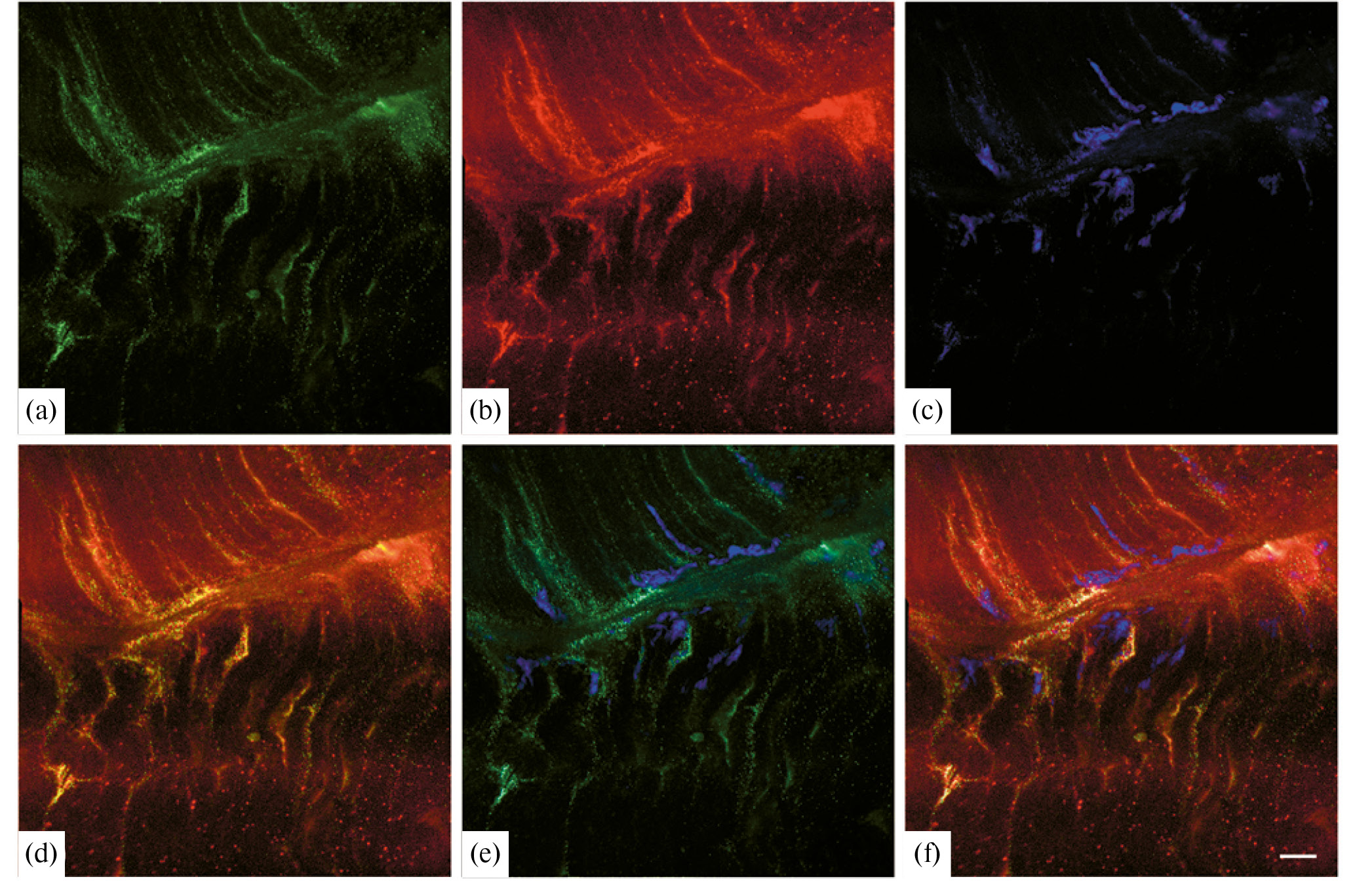 Рис. 3. Наличие Ca²⁺-кальмодулин зависимой протеинкиназы типа 2 при тройном флуоресцентном мечении препарата соматических мышечных клеток дождевого червя. (a) – Иммуномечение антителами к Ca²⁺-кальмодулин зависимой протеинкиназе типа 2 (зеленый цвет); (b) – иммуномечение антителами к пресинаптическому белку синаптофизину (красный цвет); (c) – мечение нАХР при помощи ТМР-α-Б (синий цвет); (d) – наложение изображений (a) и (b); (e) – наложение изображений (a) и (c); (f) – наложение изображений (a), (b) и (c). Масштаб 20 µm.