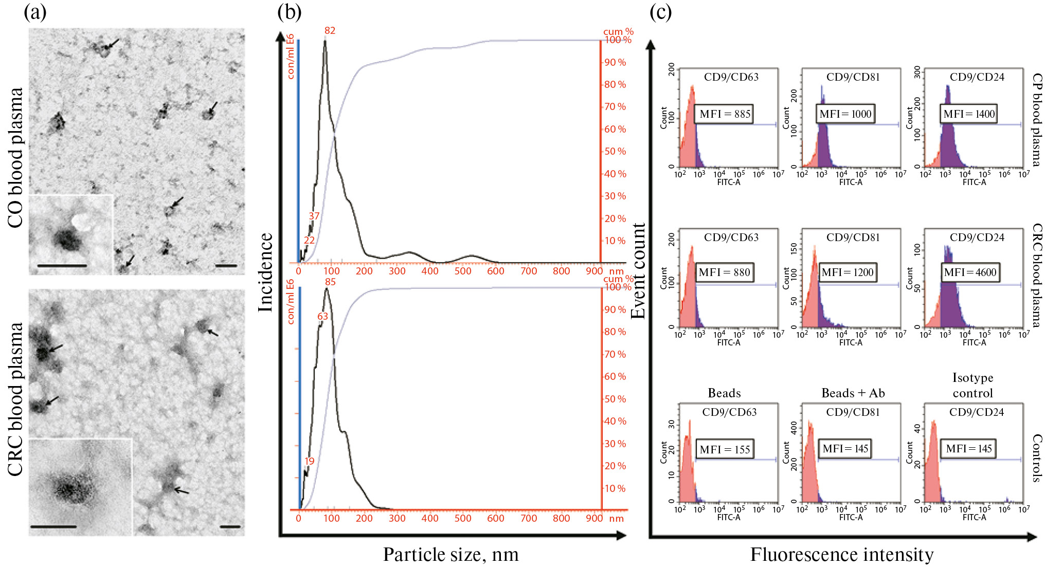 Рис. 1. Идентификация изолированных ВВ. (a) — ТЭМ показала наличие везикул с типичной морфологией и отсутствие везикул размером более 220 нм. На вставках показаны малые ВВ. Масштабные линии соответствуют 100 нм. Электронная микроскопия, отрицательное окрашивание уранилацетатом; (b) — данные анализа NTA для ВВ, изолированных из плазмы крови больных КРР и ПТК (CRC and CP). Ось абсцисс представляет собой размер частиц (нм), ось ординат — концентрацию частиц (частиц/мл), вспомогательная ось — кумулятивная частота (%). (c) — Экспрессия CD63, CD81 и CD24 на CD9-положительных sEV КРР и ПТК плазмы крови. Показаны репрезентативные средние значения интенсивности флуоресценции (MFI), каждое измерение выполнялось трижды. Для изотипического контроля (гистограмма справа) меченные комплексы частицы-антитело к CD9-sEV инкубировали с мышиным FITC IgG1 контрольным изотипом или FITC IgG2a контрольным изотипом. Показан один из репрезентативных изотипических контролей. В качестве отрицательного контроля к латексным частицам, меченным антителами CD9 (гистограмма слева), ничего не добавляли. Так же ставили отрицательный контроль, когда покрытые частицы инкубировали с антителами, коньюгированными с FITC без добавления везикул (гистограмма в центре).