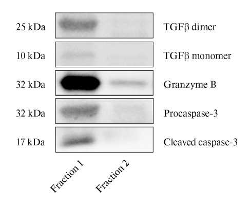 Установлено, что высокомолекулярная фракция № 1, содержащая TGFβ, вызывает повышение на 16% уровня p-SMAD2/3 в клетках трофобласта через час после сокультивирования с последующим снижением на 15–16% содержания данной фосфорилированной формы через два и более часов (рис. 6). Показано повышение на 6% уровня прокаспазы-3 в клетках трофобласта после часового сокультивирования с той же фракцией (рис. 6). Несмотря на то, что гранзим B также содержится преимущественно во фракции № 1, сокультивирование с ней клеток трофобласта в течение исследованных промежутков времени не приводило к активации в них каспазы-3, что подтверждается отсутствием выявления расщепленного фрагмента активной каспазы-3.