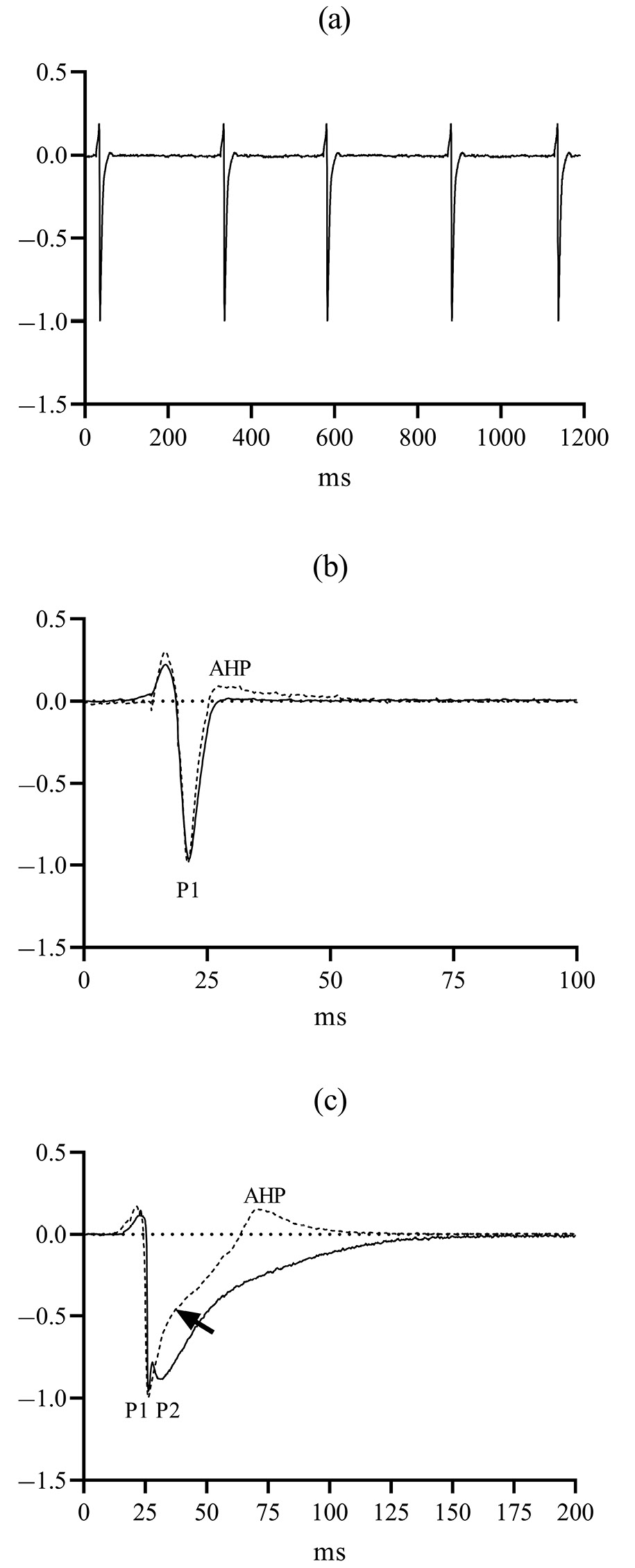 Рис. 1. Репрезентативные примеры непрерывной записи авторитмических вПД1 (a) и примеры индивидуальных профилей нормализованных вПД1 (b) и вПД2 (c) кардиомиоцитов сердец контрольных крыс. Профили индивидуальных вПД были нормализованы к величине их первого негативного пика (P1). Р2 – метка второго негативного пика вПД2. Штриховыми линиями представлены примеры сигналов, сопровождающихся фазой СГ (afterhyperpolarization, AHP). Обратите внимание, что вПД2, указанный штриховой линией, хотя и не имеет отчетливого второго негативного пика, характеризуется выраженным изломом на спаде своего единственного негативного пика (стрелка) и, поэтому тоже классифицирован, как вПД2.