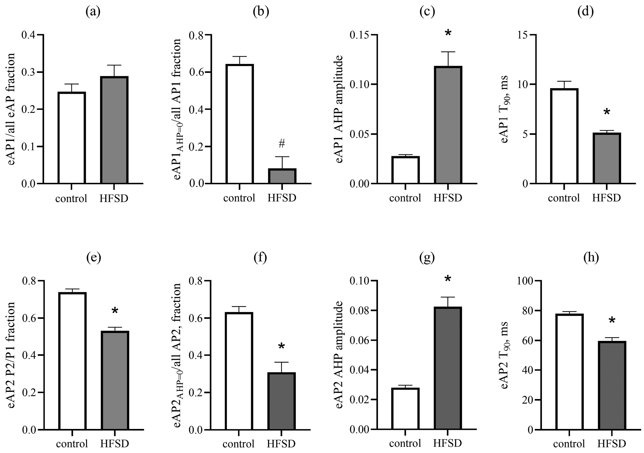 Рис. 2. Усредненные характеристики вПД субэпикарда ЛЖ сердец контрольных (10 сердец, белые столбцы) и ВЖСД (9 сердец, серые столбцы) крыс. (а) – Доля вПД1 (eAP1) по отношению к всем зарегистрированным вПД. (b) – Доля вПД1 без СГ (eAP1AHP=0) по отношению ко всем зарегистрированным вПД1. (с) – Амплитуда СГ вПД1. (d) – Т₉₀ вПД1. (e) – соотношение P2/P1 в вПД2 (eAP2). (f) – Доля вПД2 без СГ (eAP2AHP=0) по отношению ко всем зарегистрированным вПД2. (g) – Амплитуда СГ вПД2. (h) – Т₉₀ вПД2. * – t-критерий Стьюдента, p < 0.05; # – U-критерий Манна–Уитни, p < 0.05