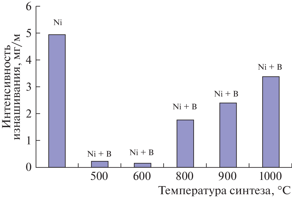 Metal matrix composite materials (CMs) reinforced with boron particles are synthesized from powders of amorphous boron and metal (Ni, Ti) at a pressure of 8 GPa and temperatures of 500–1000°C. It is established that amorphous boron crystallizes during synthesis at temperatures above 800°С. Amorphous boron particles are characterized by a hardness of ~30 GPa, an indentation modulus of elasticity of up to 270 GPa, and an elastic recovery of more than 60%. The patterns of boride formation during high-pressure synthesis are studied. It is shown that the wear resistance of a Ni–B CM synthesized at 600°С grows by more than 30 times, relative to the wear resistance of pure nickel. Reinforcing titanium with 30% amorphous boron increases wear resistance by more than two orders of magnitude, but the coefficient of friction of CMs is reduced slightly.