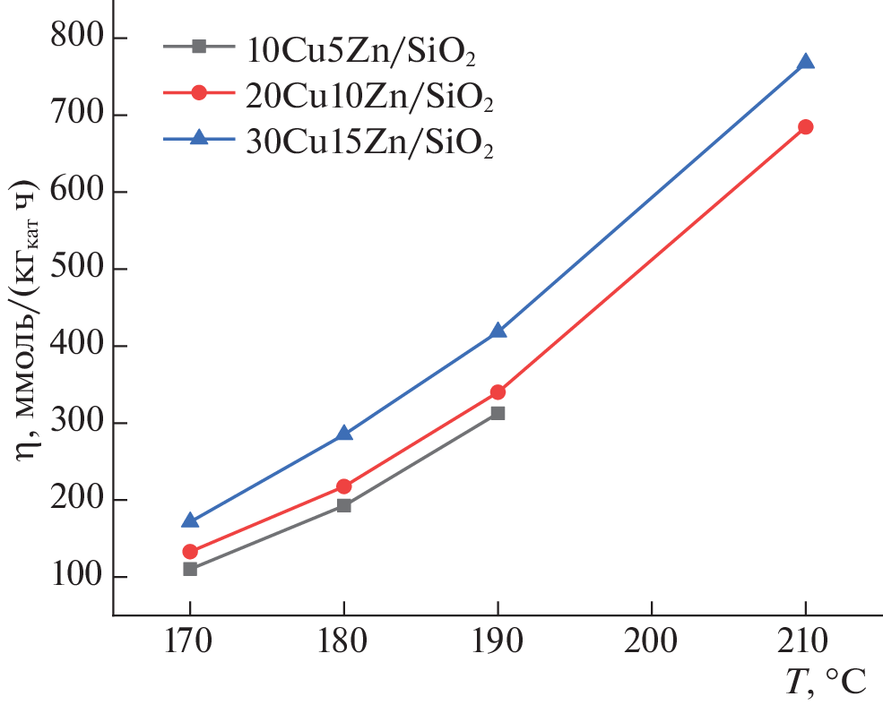 A study is performed of the catalytic properties of Cu–Zn catalysts on Al2O3 and SiO2 supports (Acros) in the reaction of CO2 hydrogenation to obtain methanol. A sample of 30Cu15Zn/Al2O3 displays great selectivity toward methanol. A sample of 30Cu15Zn/SiO2 has the highest methanol performance. The methanol performance of a sample of 10Cu5Zn/Al2O3 is doubled when the pressure is raised from 10 to 30 atm, and a 94% increase in selectivity is observed. A sample of catalyst 10Cu5Zn/SiO2 does not lose its activity after 10 h of a catalytic reaction, and its methanol performance grows with repeated use