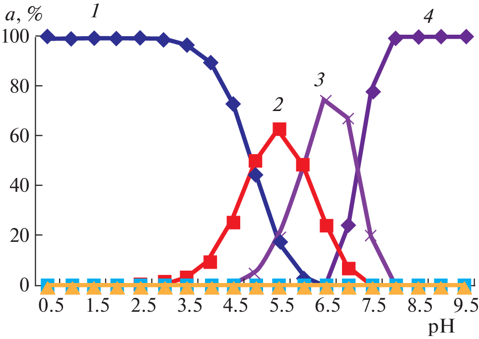 Processes of the formation of coordination compounds in the Fe(II)–Fe(III)–H2Sal–C2H5OH–H2O system are studied using the Clark–Nikolsky oxidation potential at a temperature of 298.16 K and an ionic strength of the solution of 1.0 mol/L against a sulfate background. The formation of complexes of the following compositions is established: [FeHSal(H2O)5]2+, [Fe(HSal)2(H2O)4]+, [Fe(HSal)2OH(H2O)3]−, [Fe(HSal)2(OH)2(H2O)3]3−, [FeIIIFeII(HSal)2(OH)2(H2O)8]+, [FeHSal(H2O)5]+, [Fe(HSal)(OH)(H2O)4]0, [FeIIFeIII(HSal)2(OH)2(H2O)8]+. The constants of formation of all complexes are calculated via iteration of the oxidizing function, and the areas of their dominance and maximum degrees of accumulation are determined.