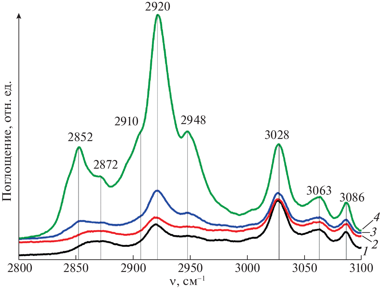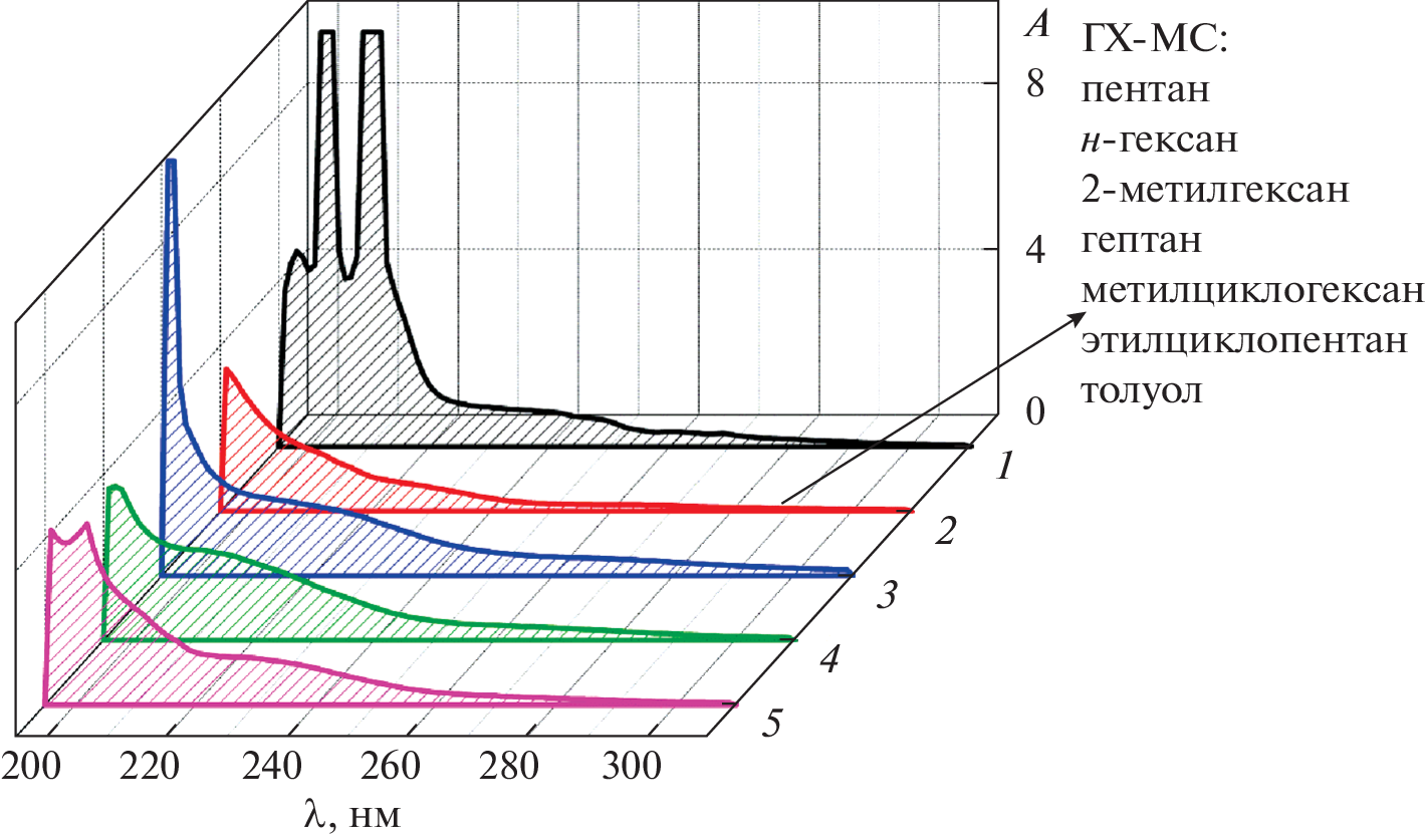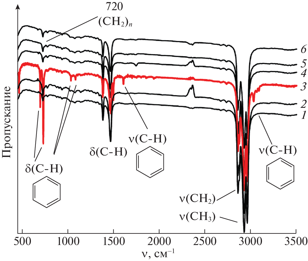 Molecular spectroscopy in the UV and IR ranges is used to perform a comparative study of the decomposition of toluene and heptane during mechanical activation with titanium. It is shown that high-energy mechanical processing is effective for obtaining low-molecular-weight alkanes, the amounts of which are largely determined by the nature of the hydrocarbons. The effect the mill carrier’s speed of rotation has on the depth of hydrocarbon decomposition and the composition of products of the mechanical processing of the liquid phase is considered. It is shown that at a speed of 600 rpm, heptane begins to decompose at short periods of mechanical activation (MA), while toluene is stable up to 30 h MA. Considerable structural and chemical transformations occur in toluene after only 20–30 h of mechanical treatment at a speed of 890 rpm.