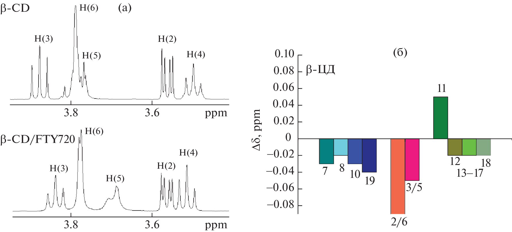 The solubilizing effect of β-cyclodextrin on fingolimod, a new generation immunosuppressant, is studied for the first time. A possible 20× increase in the solubility of fingolimod due to the penetration of the hydrophobic fragment of the drug molecule into the macrocyclic cavity of the cyclodextrin is shown. Data driven 1H NMR spectroscopy and computer modeling suggest the configuration of the resulting inclusion complexes. The constant of the complex’s stability and its energy of complexation are calculated, and the formation of hydrogen bonds between fingolimod and β-cyclodextrin is considered.