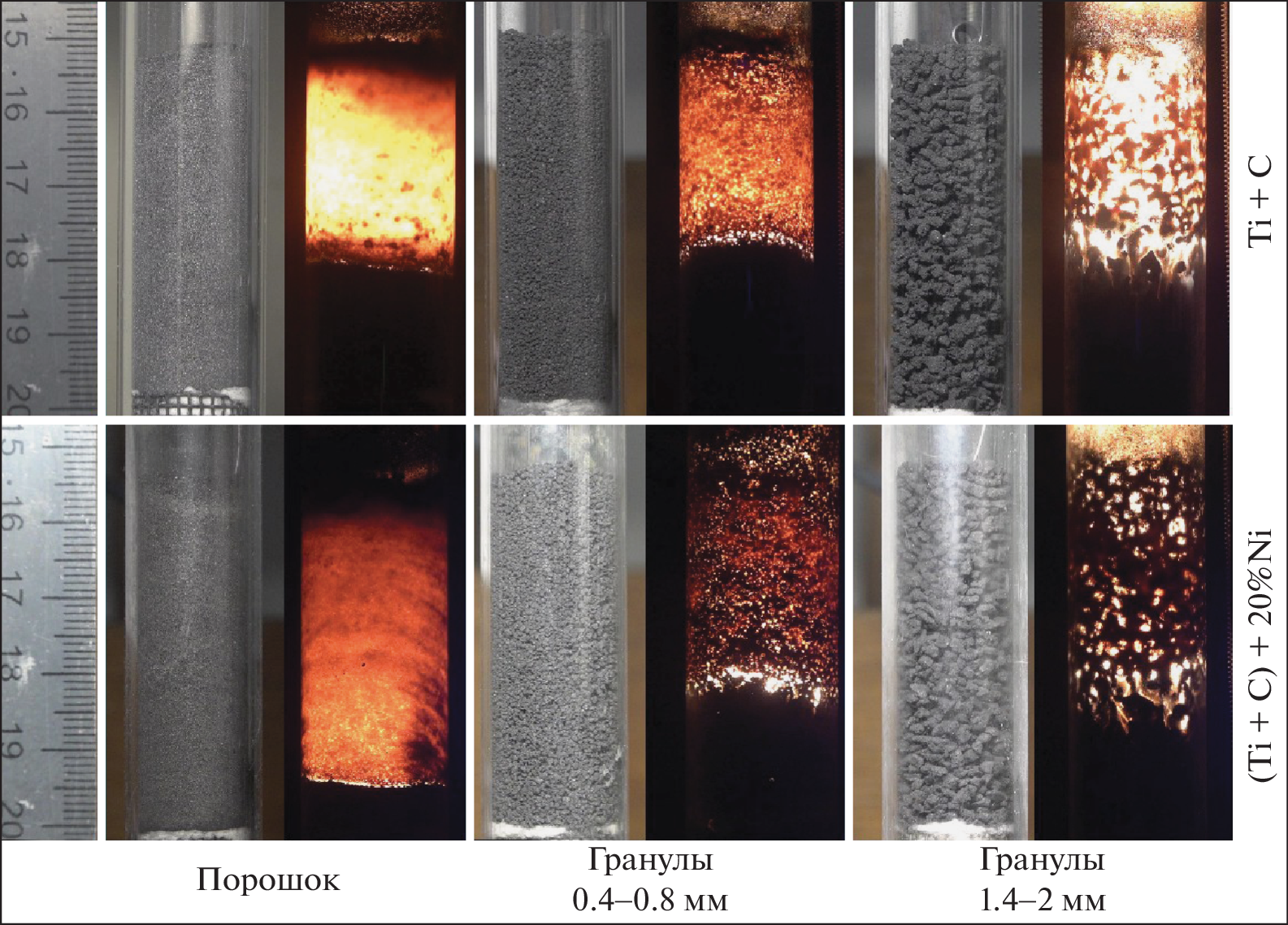 An original comparative study is performed of the combustion of granular and powder Ti–C and (Ti–C)+20%Ni mixtures with granules of different sizes, while varying titanium particle sizes in a range of 31–142 mm. It is found that the rate of combustion of the (Ti–C)+20%Ni powder mixture is 2–3 times higher than that of a Ti–C mixture, despite the lower temperature of combustion of the former. The results are interpreted in terms of the convective–conductive combustion model and attributed to the inhibitory effect of impurity gases that evolve while heating the component particles ahead of the combustion front. The rate of combustion of the granules’ material is calculated using those of granular mixtures with granule sizes of 0.6–1.7 mm. This rate can be thought of as the rate of combustion of a powder mixture in which the effect of impurity gases is neutralized. It is proposed that the ratio of the rates of combustion of the material inside the granules and the powder mixtures be used as a quantitative measure of the effect impurity gas evolution has on the combustion of powder mixtures.