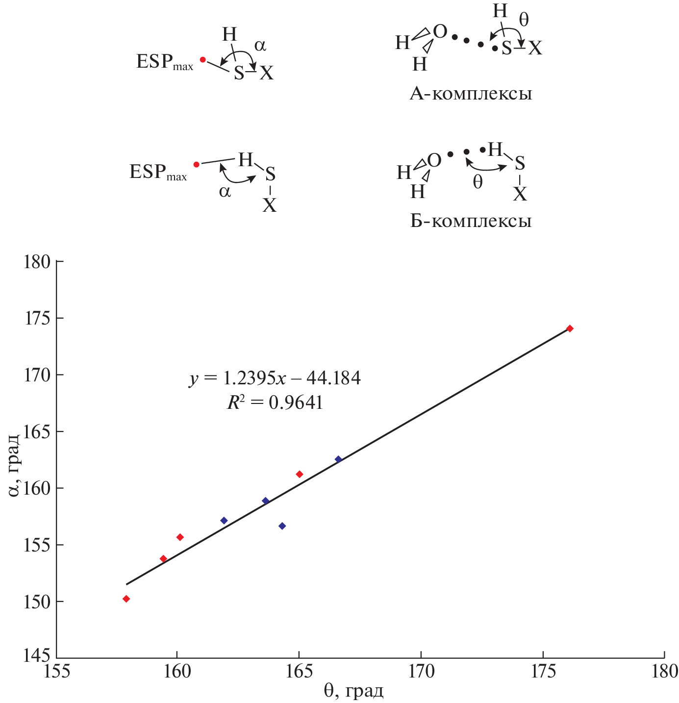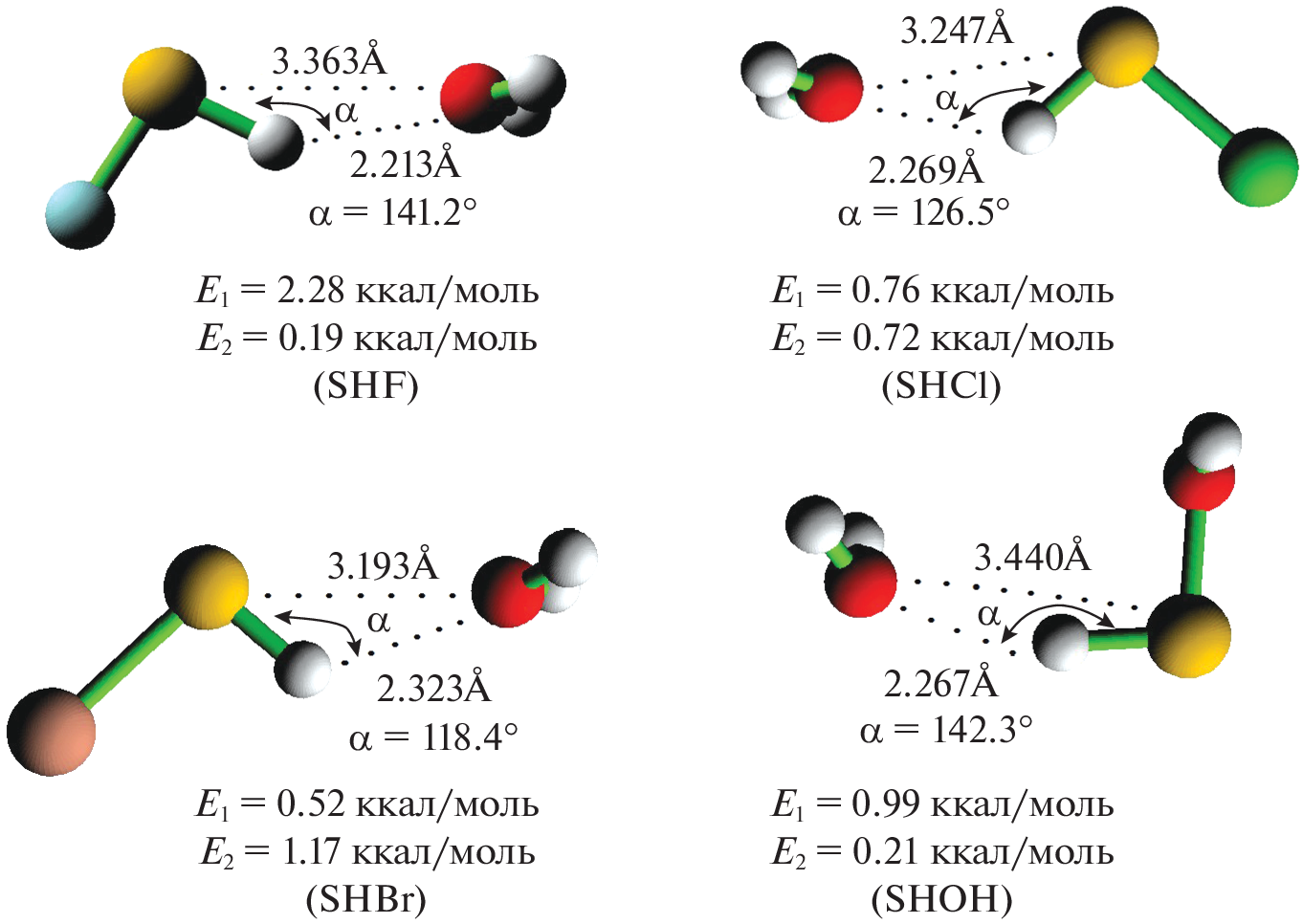 Binary complexes with a chalcogen (A complexes) and hydrogen (B complexes) bond formed by SHX molecules (X = F, Cl, Br, OH) of divalent sulfur and a water molecule have been calculated by the MP2/aug-cc-pVTZ quantum chemical method. An NBO analysis was performed for complexes of both types along with the topological analysis of electron density and decomposition of the binding energy into components. The quantum chemical calculations showed that the binding energies, interorbital interaction energies of monomers, and electron densities at the critical point (3, –1) of intermolecular contact are close in the A and B complexes. The main contribution to stabilization of the complexes is made by the electrostatic interaction; in the B complexes, however, the contribution of the charge transfer component is also significant. The dispersion energy plays a significant role in the binding of monomers in complexes of both types. According to the calculations, the interconversion of A and B complexes occurs with a very low activation barrier.