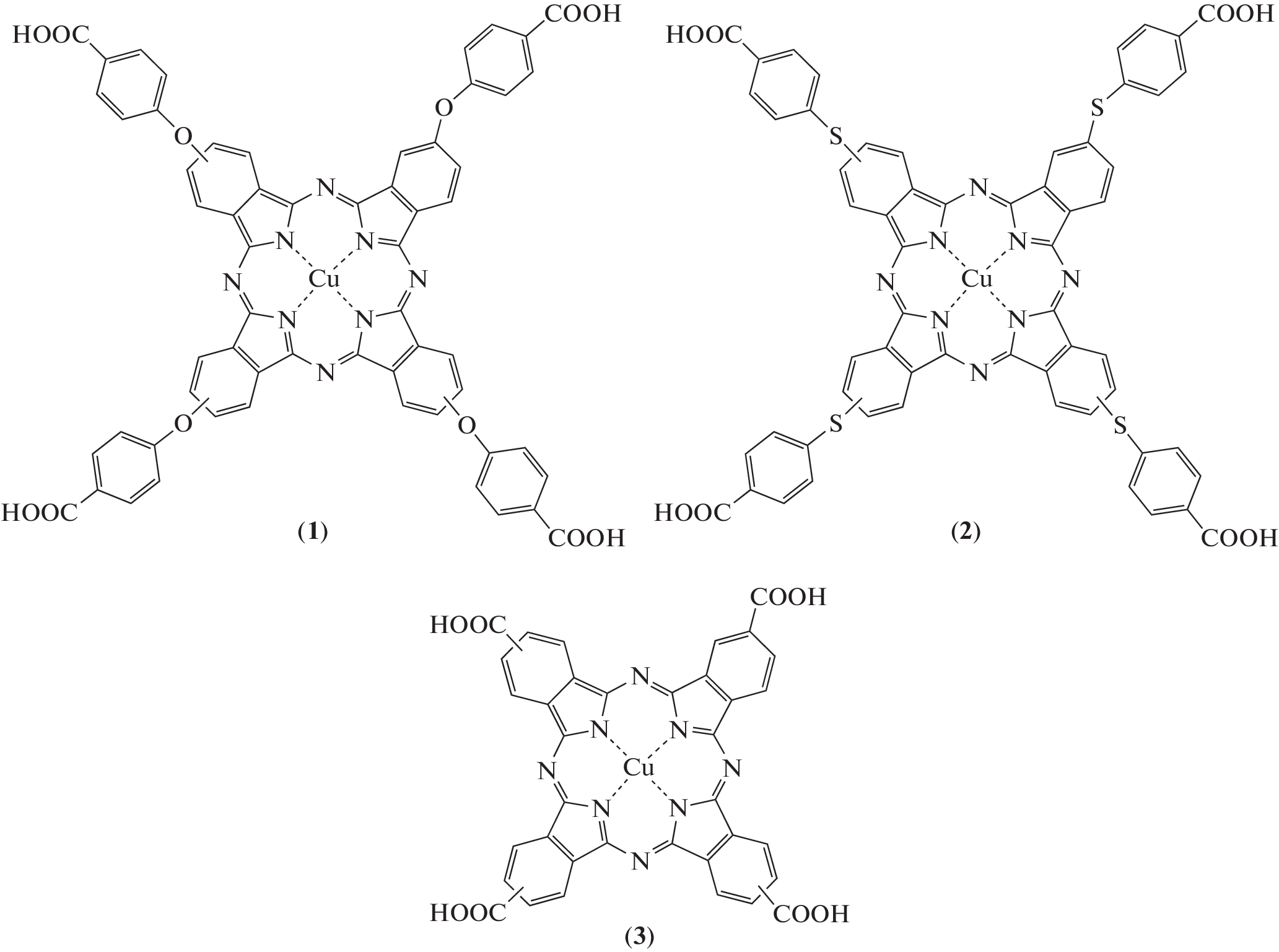 The authors obtain complexes CuPc(4-S-C6H4-COOH)4 and CuPc(4-O-C6H4-COOH)4 that are insoluble in water. The standard enthalpies of formation of these compounds are calculated using additive groups based on group systematics with Benson-type classification of fragments, allowing for the influence of the atoms’ primary environment. Thermal effects of the dissolution of crystalline phthalocyanines in aqueous solutions of various KOH concentrations at a temperature of 298.15 K were determined via direct calorimetry. Thermal effects of the stepwise dissociation of CuPc(4-S-C6H4-COOH)4, CuPc(4-O-C6H4-COOH)4 are calculated using the HEAT computer program. Standard enthalpies of formation are calculated for products of the dissociation of CuPc(4-S-C6H4-COOH)4 and CuPc(4-O-C6H4-COOH)4 in an aqueous solution.