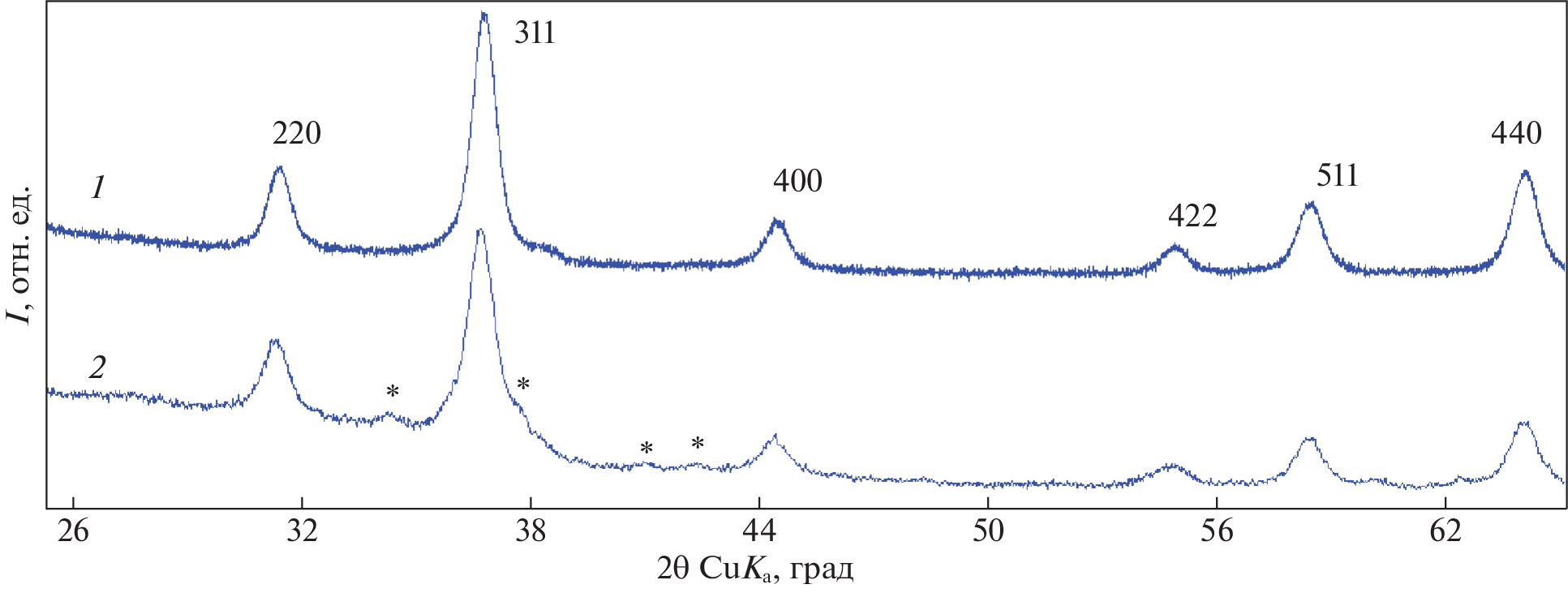 Iron oxide nanopowders are synthesized via chemical precipitation. It is shown that synthesis produces an iron oxide phase with a magnetite structure (either a magnetite–maghemite solid solution or a mixture of this solid solution and goethite). The sizes of the CSR and particles for the main phase are ~10–20 nm. The synthesized iron oxide powders have developed surfaces, specific surface area SBET ≈ 92 and 117 m2/g, and identical fairly large specific pore volumes (VP/P0→0.99/0→0.99 = 0.35 cm3/g). It is shown that additional in situ ultrasonic treatment of the magnetic iron oxide nanoparticles in the mother liquor results in abrupt oxidation of iron(II) ions and creates a nonmagnetic impurity phase of goethite.