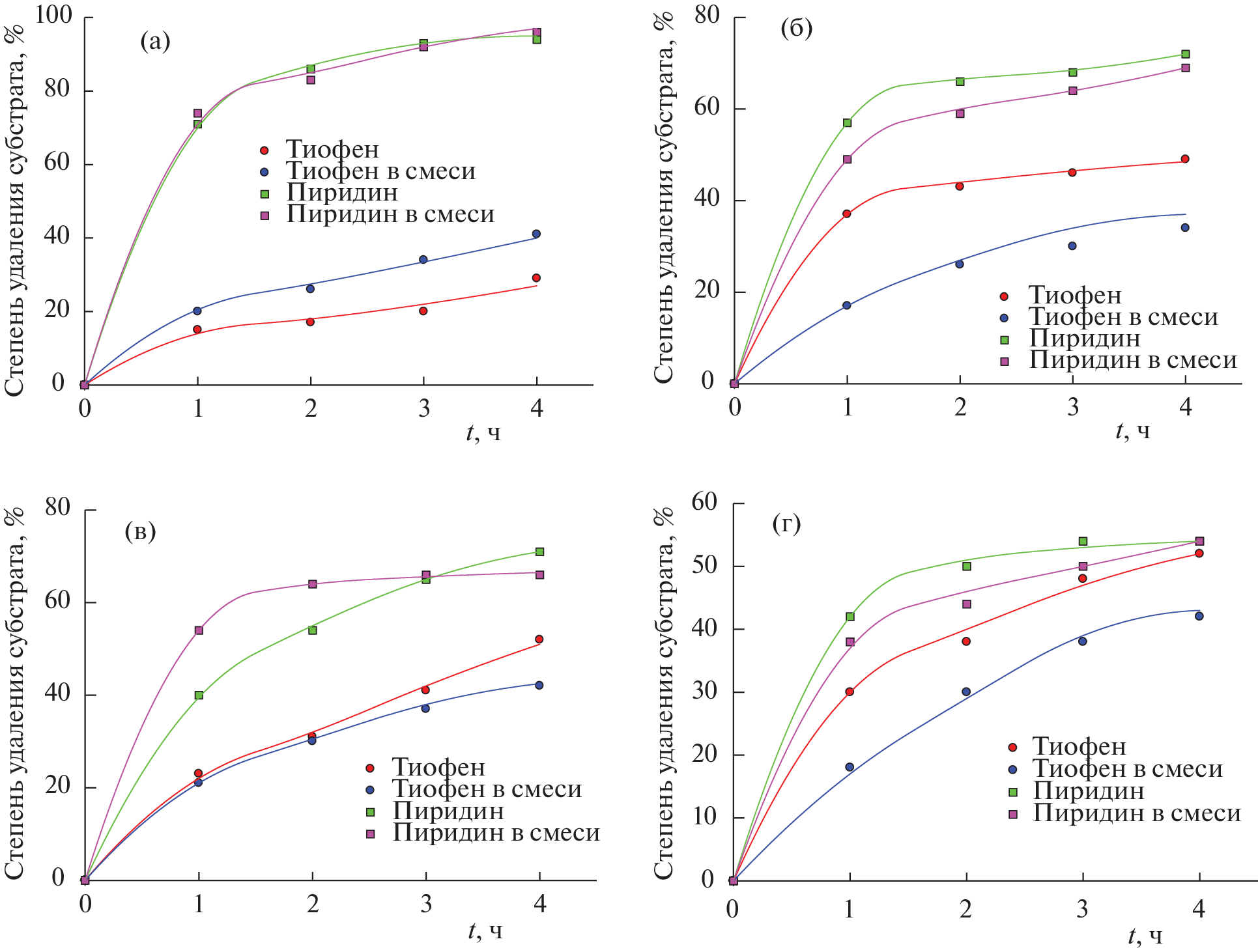 A set of silica gel-immobilized compounds is synthesized that consists of ethylimidazole cations and anions of phosphotungstic acid (lacunar (PW11) or mixed (PW11M), where M = Zn, Ni, Cu, Co, Mn). The composition and textural characteristics of the compounds are determined by physicochemical means (IR spectroscopy, XPS, SEM/EDX, adsorption). The synthesized heterogeneous composites are active in the oxidation of sulfur- and nitrogen-containing components of petroleum feedstocks with hydrogen peroxide. A comparative analysis is performed of the samples’ catalytic properties in the oxidation of both individual substrates (thiophene, dibenzothiophene, methyl phenyl sulfide, pyridine) and their mixtures.