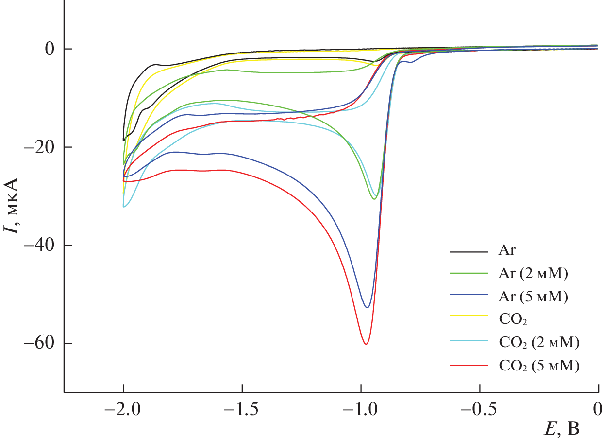 A study is performed of the electrocatalytic activity of substituted pyridine salts (N-hydro-, N‑methyl-, and N-phenyl-2,4,6-triphenylpyridinium perchlorates) in the electroreduction of carbon dioxide to carbon monoxide. The effect the natures of the substituent and the H+ source have on the efficiency of the process is determined. The main reasons for the occurrence of the electrocatalytic process are identified, and the values of TOF (catalyst speed) and TON (number of revolutions of the catalyst) are calculated. It is shown that the values of TOF and TON fall as the pK of the acid rises.