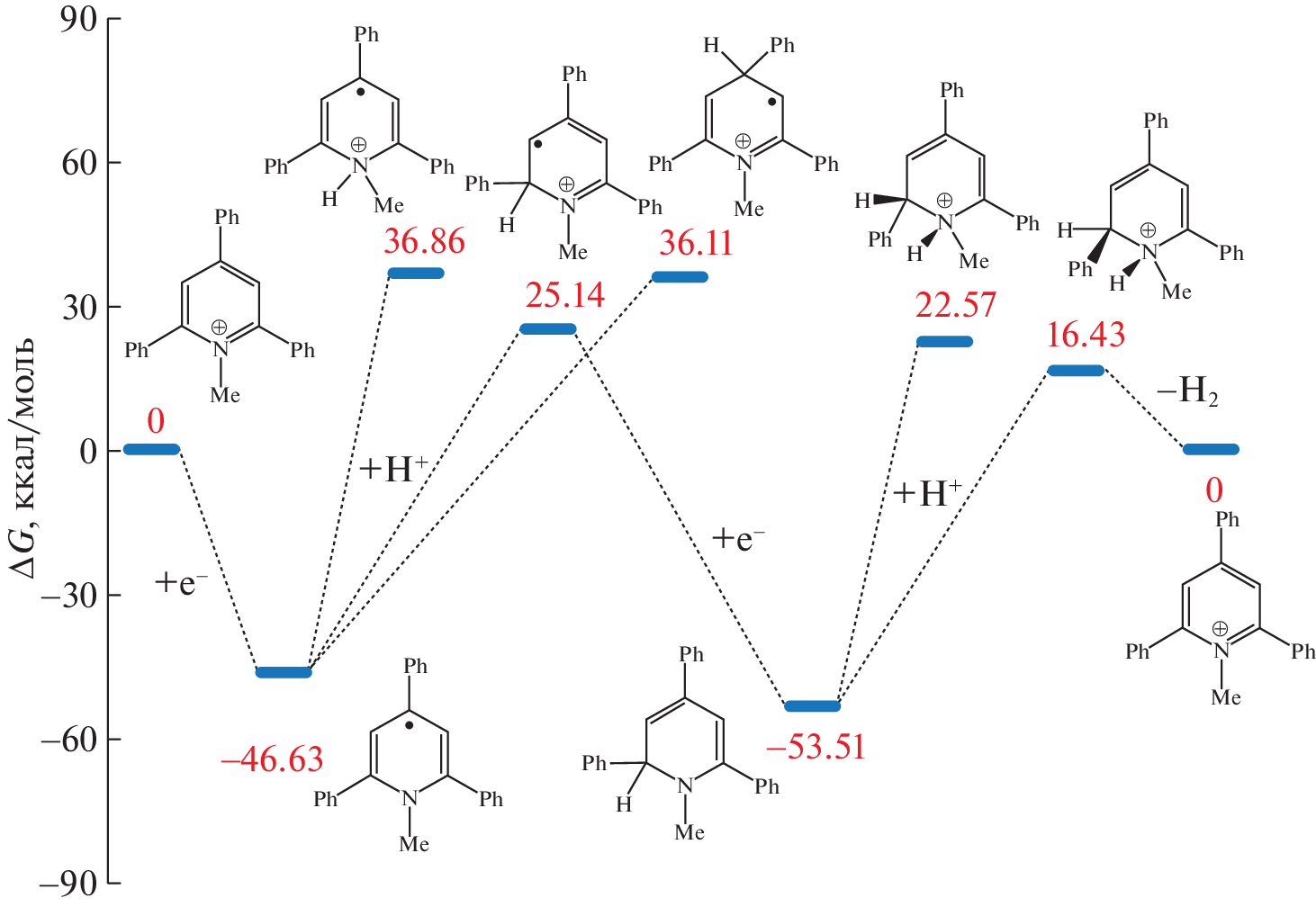 DFT is used to study thermodynamic aspects of the mechanism of the electrocatalytic formation of molecular hydrogen using N-methyl-2,4,6-triphenylpyridinyl cations. A structural and energetic analysis of the corresponding intermediate products is performed. It is shown that electrocatalytic formation proceeds through a stage of forming C2-protonated radical cations and their subsequent reduction.