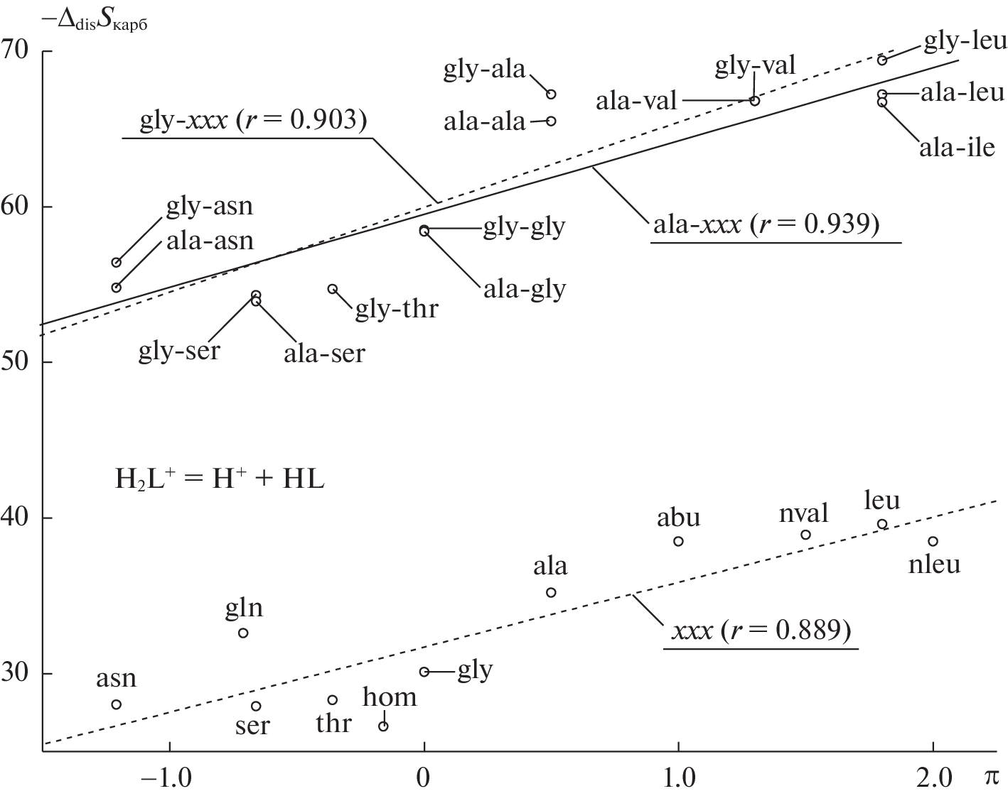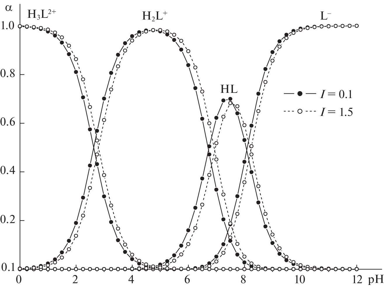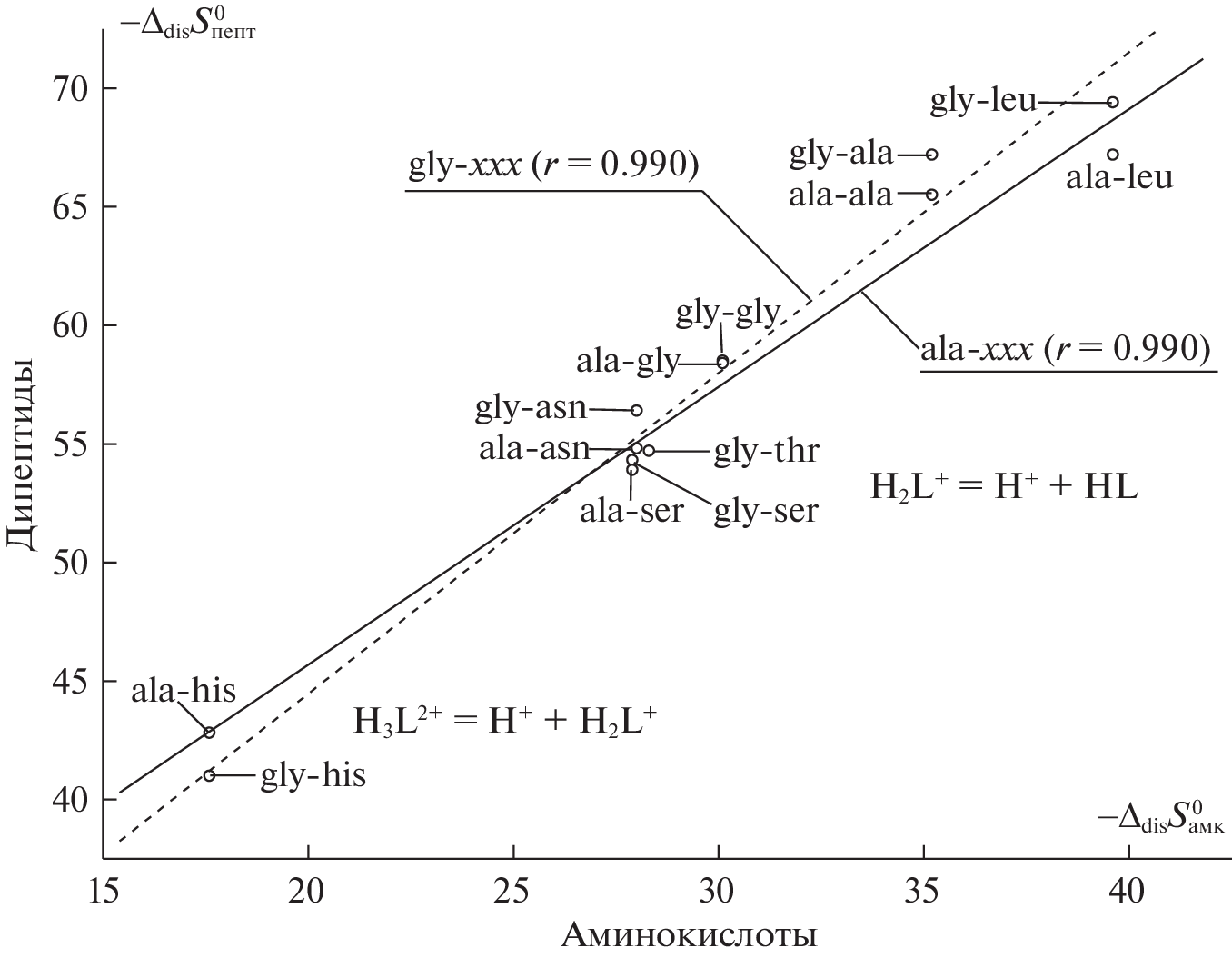 Constants of the stepwise dissociation of L-alanyl-L-histidine (HL) at 298.15 K and ionic strengths of 0.1, 0.5, 1.0, and 1.5 (KNO3) are found potentiometrically. Thermal effects of dissociation are measured for the dipeptide via direct calorimetry. Standard thermodynamic parameters (pK°, ΔdisG°, ΔdisH°, and ΔdisS°) of HL protolytic equilibria are calculated from thermochemical and potentiometric data obtained under identical experimental conditions. The results are compared to those of similar compounds.