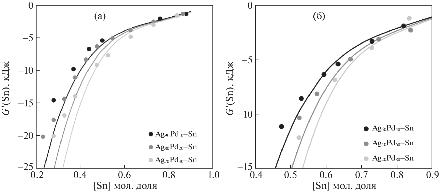 CALPHAD modelling of the Ag–Pd–Sn ternary system has been performed. The disordered phases, the melt and the fcc phase were described using the substitutional solution model. Sublattice models were used to describe intermetallic compounds and the ternary phase. The two-sublattice model (Ag,Pd)4(Ag, Sn) used for the ternary phase made it possible to reproduce the inclination of its homogeneity range. The results of the thermodynamic calculation of the Ag–Pd–Sn system are in good agreement with the experimental data on phase equilibria and enthalpies of formation of the liquid. The agreement with the data on the partial Gibbs energy of tin in the liquid is somewhat worse.