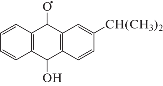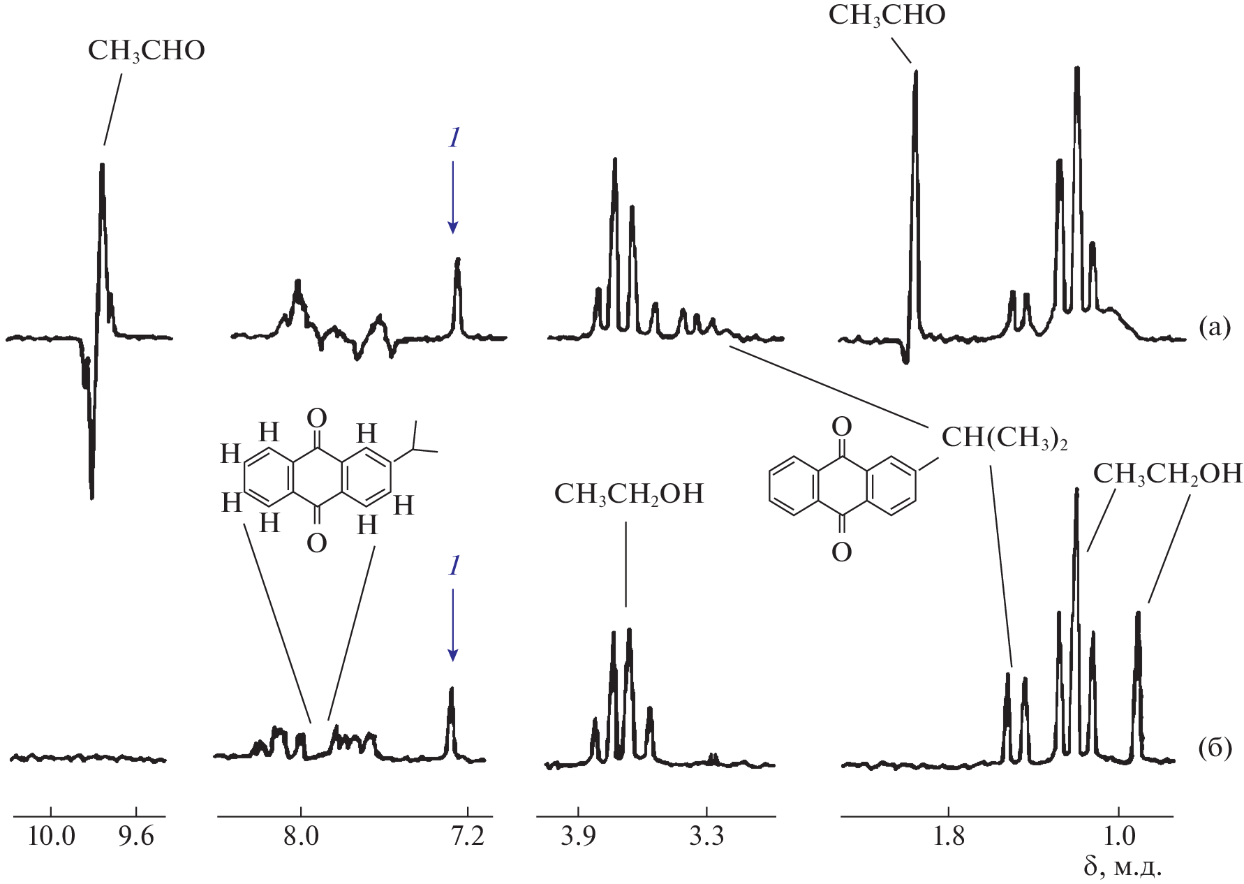 The mechanism and products of the photoreaction of 2-isopropyl-9,10-anthraquinone (1) with ethanol have been established. An analysis of the signals of chemical nuclear polarization (CNP) showed that during the formation of CNP, only the mechanism of singlet-triplet transitions in radical pairs takes place without the participation of a triplet mechanism. In the study of the phase of multiplet and integral effects, the elementary acts of photoreaction were determined, and the structure of the anthrasemiquinone radical participating in the reaction was established.