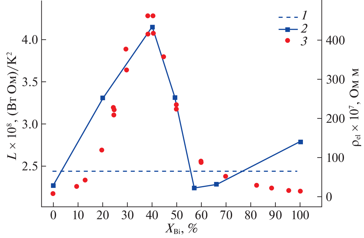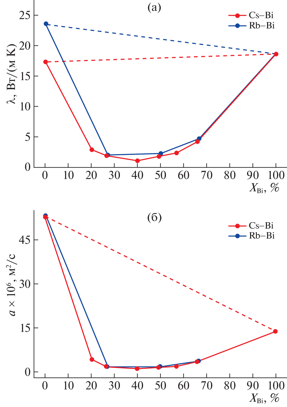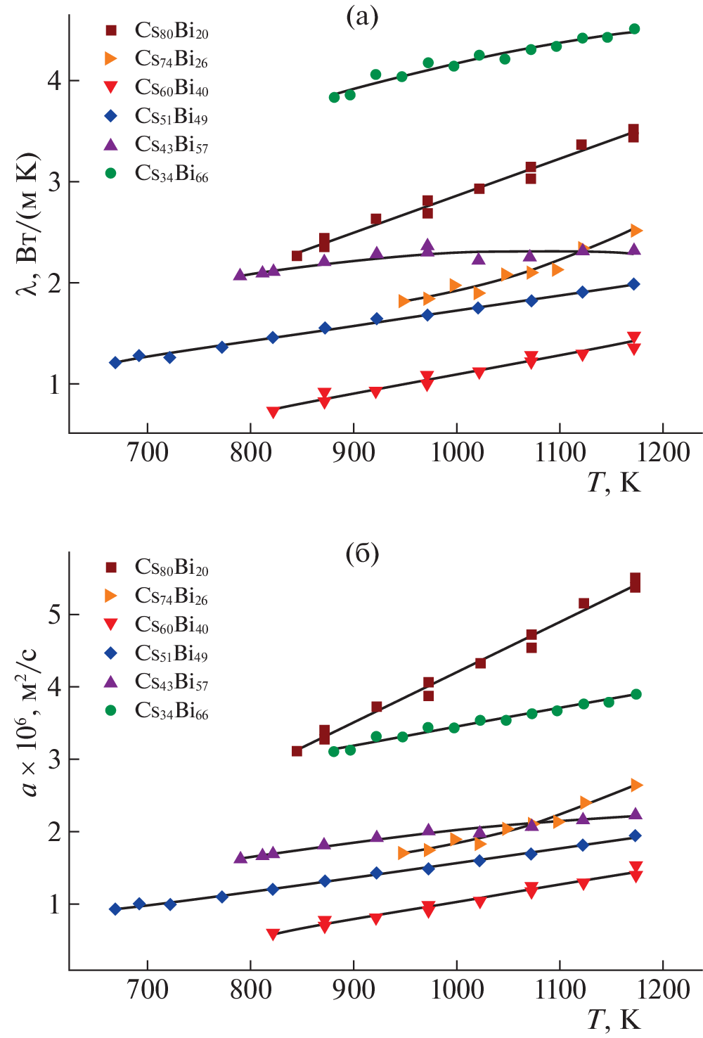 The thermal conductivity of liquid alloys of the cesium–bismuth system with 20–66 at % Bi in the temperature range from the liquidus line to 1173 K has been studied experimentally with an error of 4–6%. It was found that the thermal conductivity of liquid cesium bismuthides for the indicated compositions and temperatures takes low values from 0.7 to 4.5 W/(m K) typical for liquid salts. The thermal diffusivity and Lorenz number were calculated from the results of thermal conductivity measurements. An analysis of the temperature and concentration dependences of the studied properties indirectly confirms current views on the presence of ordered structures called ionic complexes in alkali metal bismuthide melts, which significantly affect the thermophysical properties of melts and are destroyed at elevated temperatures.