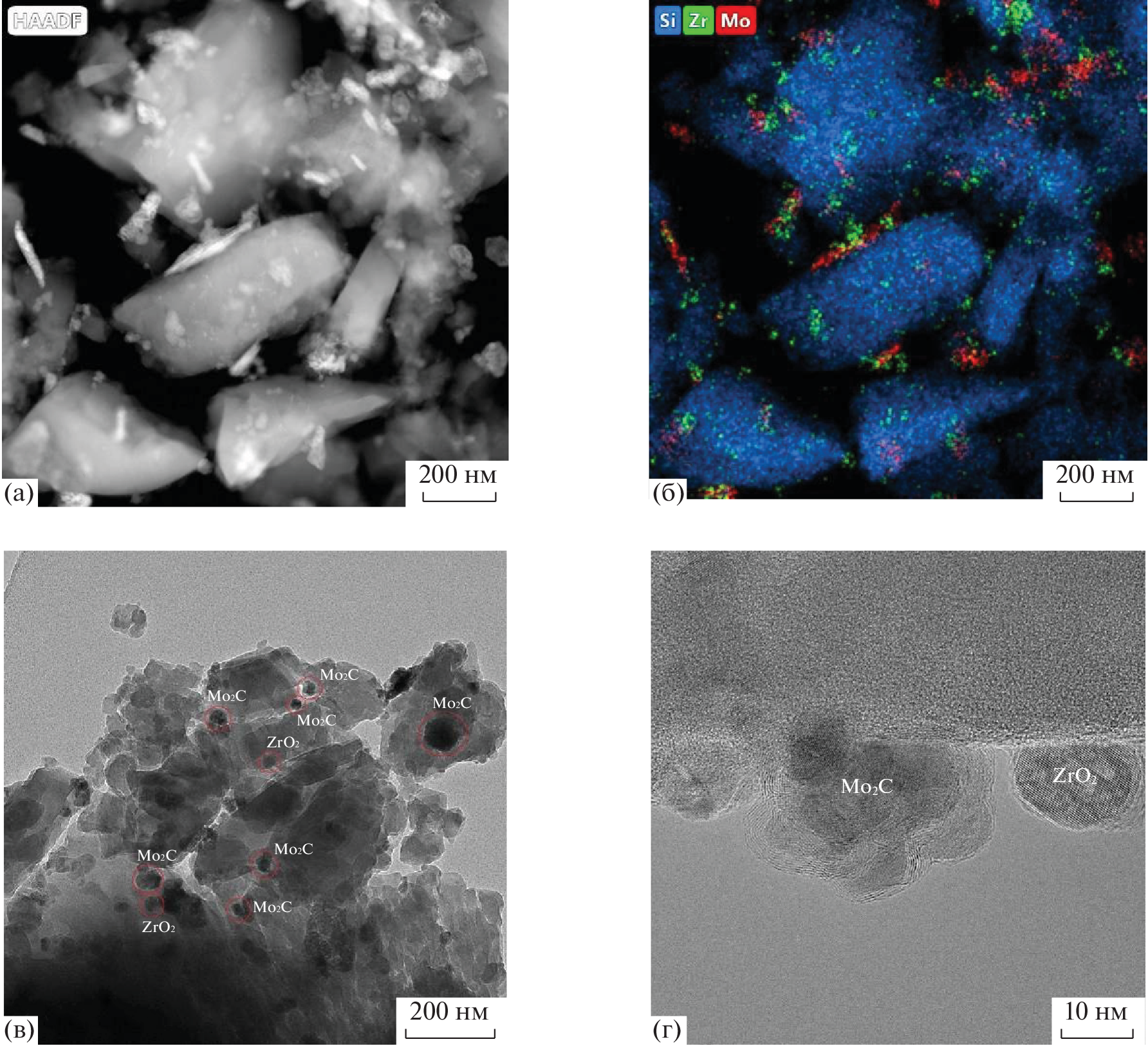 The effect of the method for the introduction of zirconium in the 4Mo/ZSM-5 catalyst and of its amount on the physicochemical and catalytic properties of the catalyst during the nonoxidative conversion of methane into aromatic hydrocarbons (benzene and naphthalene) has been studied. The catalyst was modified with zirconium by impregnation and solid phase mixing. The resulting zeolite catalysts were studied by IR spectroscopy, X-ray diffraction analysis, low-temperature nitrogen adsorption, temperature-programmed ammonia desorption, scanning and transmission electron microscopy, and simultaneous thermal analysis. With an increase in the zirconium concentration introduced in the 4Mo/ZSM-5 catalyst, the strength and concentration of its strong acid sites that are responsible for methane aromatization decrease regardless of the method of modification. The particle size and morphology of the catalyst, the distribution of Mo and Zr in them, and the presence of coke deposits on their surface were determined by scanning and transmission electron microscopy. The catalytic tests and subsequent thermal analysis of the samples showed that the addition of zirconium to the 4Mo/ZSM-5 catalyst leads not only to an increase in its catalytic activity, but also to operational stability due to the lower rate of coke formation. It was established that 4Mo/ZSM-5 modified with 1 wt % Zr by solid-phase synthesis is the most effective catalyst in methane dehydroaromatization (DHA).