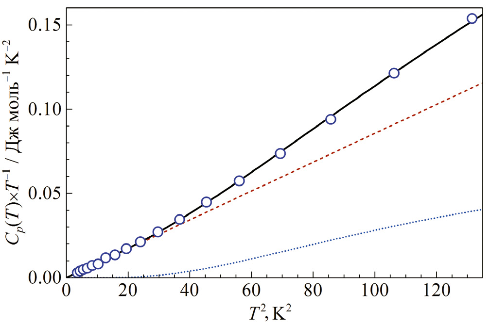 Для экстраполяции к 0 K и описания теплоемкости в области низких температур был выбран подход [17, 8], в рамках которого зависимость Cp(T) представлялась в виде суммы теплоемкостей модели Дебая CD(T) и модели Эйнштейна CE(T):