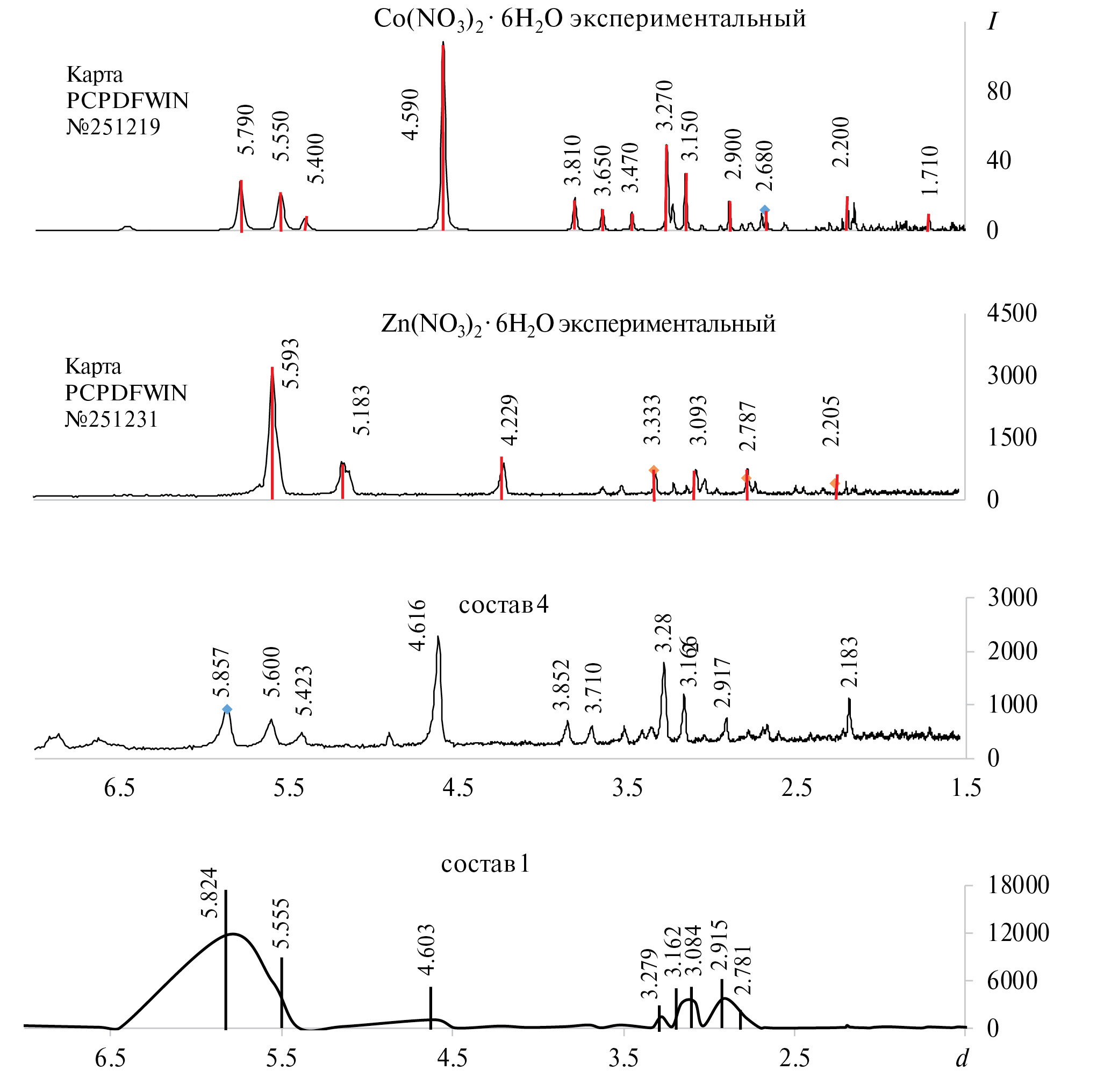 Во 2 серии синтезов ожидаемого разложения нитратов цинка и кобальта не произошло. Это подтверждается экспериментальными дифрактограммами, представленными на рис. 3. Значения межплоскостных расстояний dрасч близки к табличным значениям dэтал кристаллогидратов Zn(NO3)2∙6H2O и Co(NO3)2∙6H2O, взятых из базы данных PCPDFWIN [5].