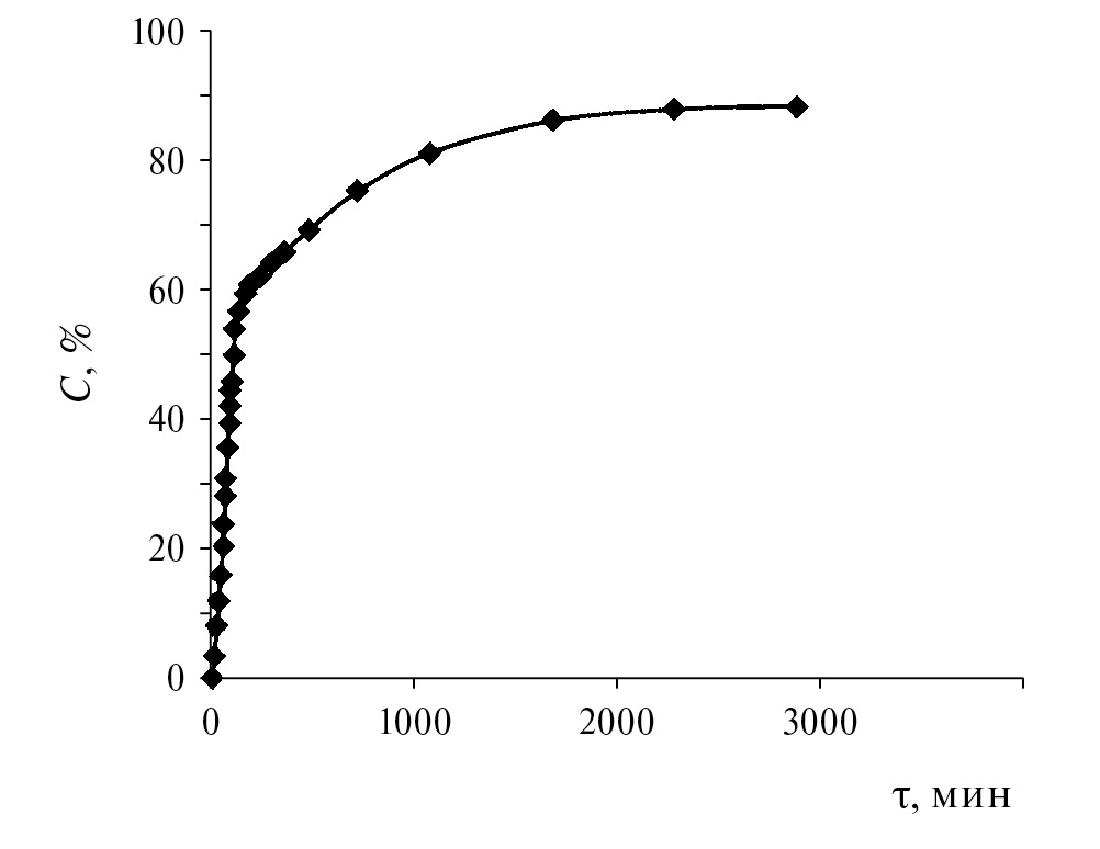 Рис. 4. Конверсия воды в гидрат при изобарном гидратообразовании СО2 и постоянной температуре для 0.5 мас.% раствора L-лейцина. Р = 2.8 МПа, Т = 275 К.