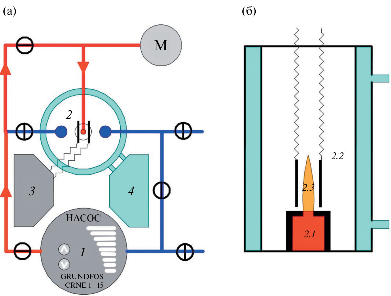 Рис. 1. Схема лабораторной установки (а) и кавитационной камеры (б): 1 – насос, 2 – кавитационная камера, 2.1 – форсунка, 2.2 – пьезоэлементы, 2.3 – кавитационное облако, 3 – генераторы высокой частоты 1.7 МГц, 4 – термостат.
