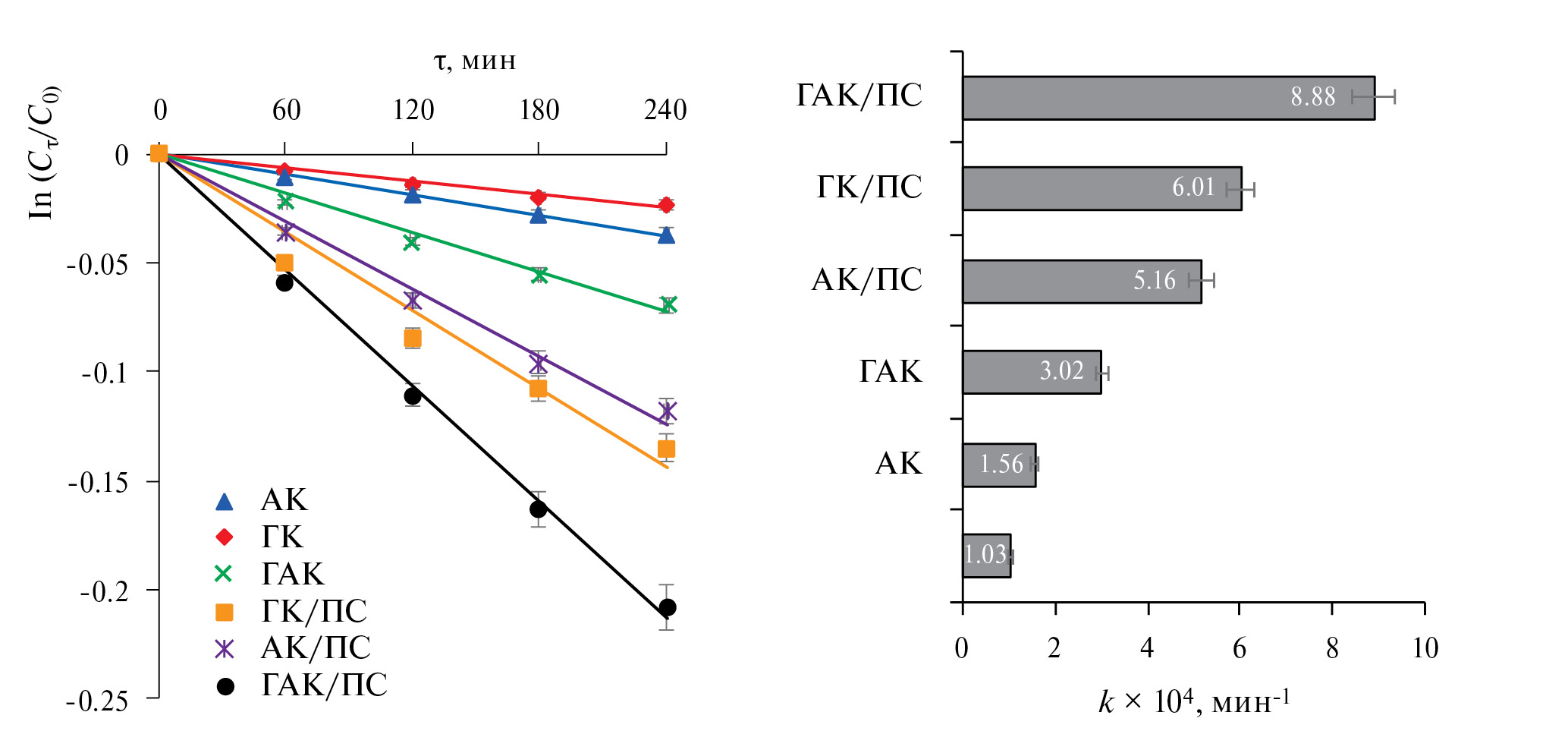 Эффективность процесса окислительной деструкции ЦЕФ возрастает в ряду: ГК < АК < ГАК < АК/ПС < ГК/ПС < ГАК/ПС.