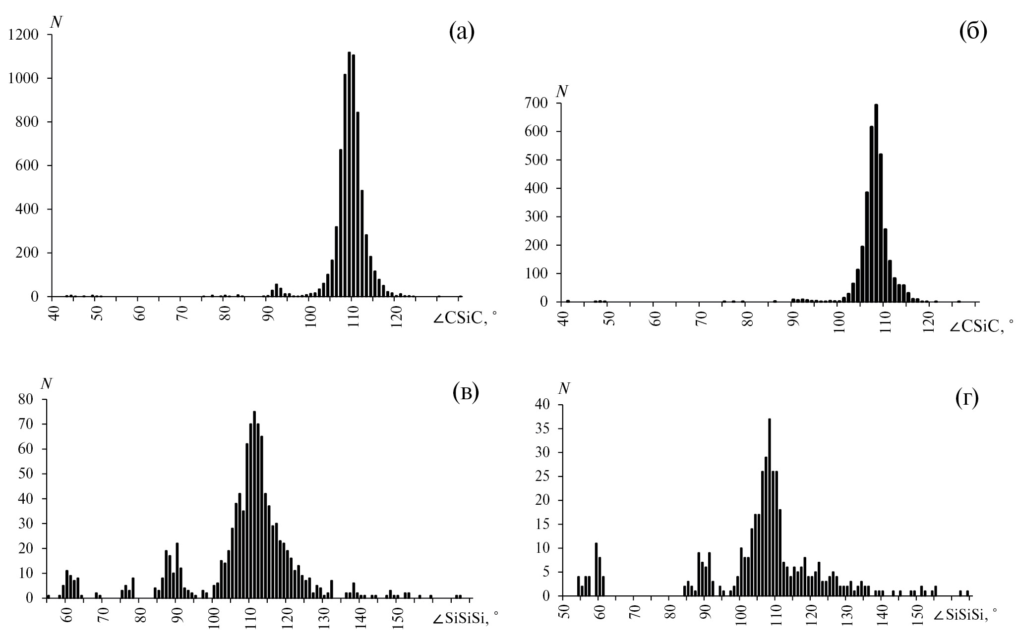 Рис. 1. Распределение валентных углов в случае КП состава SiC4 (а), SiCnSi4–n (n = 2, 3) (б, в) и SiSi4 (г) в зависимости от величины ∠XSiX (X = C, Si). Гистограммы построены с шагом 1°