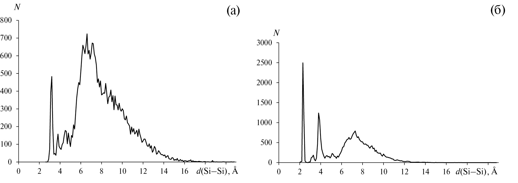 Дополнительный анализ показал, что распределение межатомных контактов в зависимости от расстояния Si–Si в ПВД атомов в Si-подрешетках достаточно неравномерно (рис. 6), что обусловлено различным способом связывания комплексов SiCn и SiCnSim друг с другом. На графиках, представленных на рис. 6, отчетливо видны мощные максимумы в диапазоне 2–4 Å. В случае комплексов SiCn, график распределения межатомных расстояний Si–Si в Si-подрешетках которого представлен на рис. 6а, максимум, располагающийся в области примерно из 3.22(9) Å, соответствует атомам кремния, находящимся в пределах одной молекулы, как и базисный атом Si. В случае комплексов SiCnSim первый максимум 2.37(5) Å на рис. 6б отвечает образованию химических связей Si–Si, в то время как второй пик 3.94(17) Å, как и в случае комплексов SiCn, обусловлен наличием нескольких атомов кремния, входящих в состав одной молекулы. Типичное расположение атомов кремния в Si-подрешетке с характерным межатомным расстоянием представлено на S-Fig. 2 в приложении.