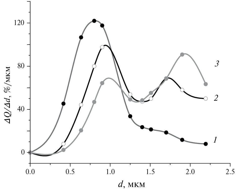 Рис. 2. Дифференциальные кривые численного (1), поверхностного (2) и объемного (3) распределения пор гуминовых кислот