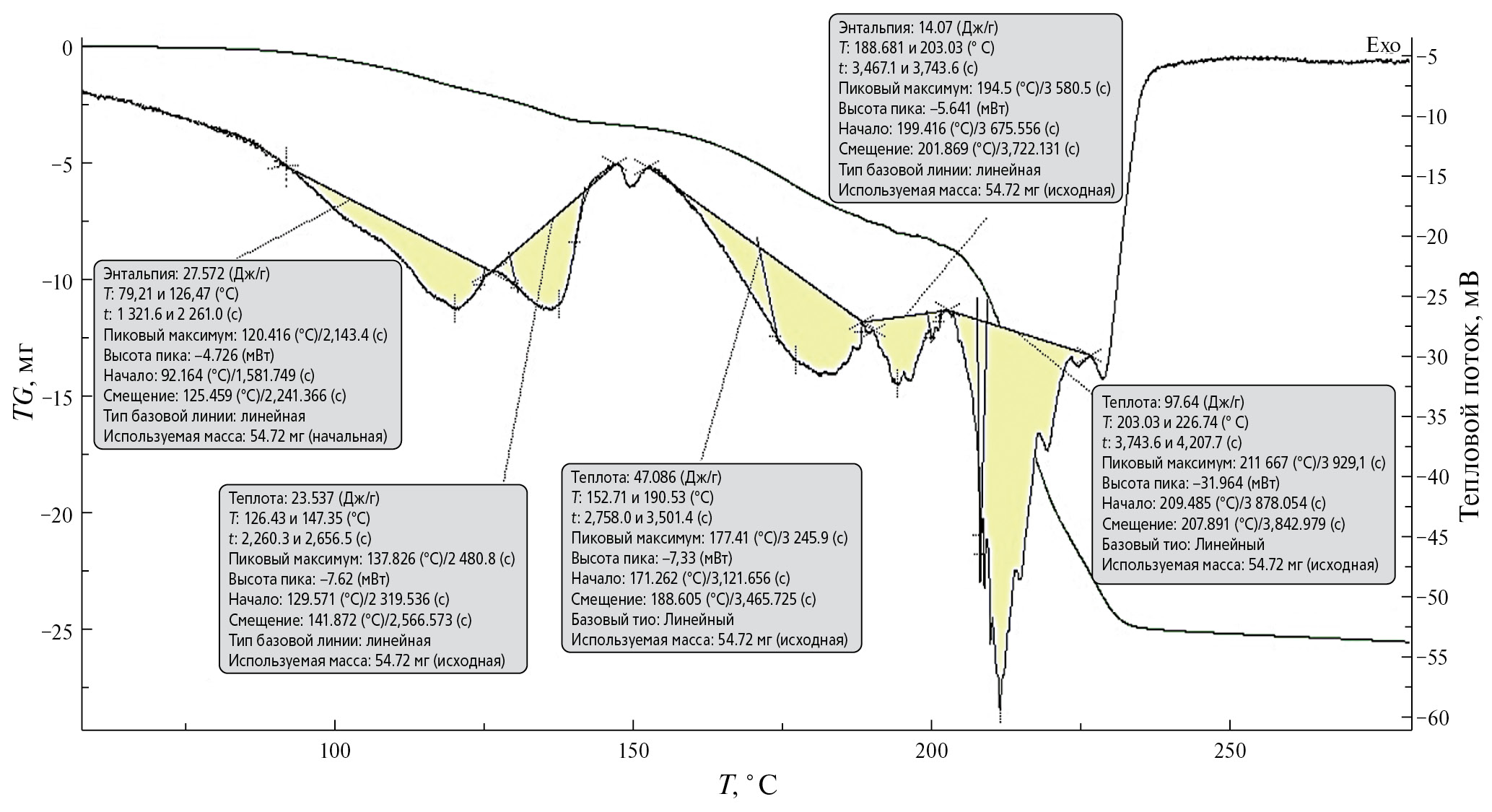Известно, что в зависимости от условия эксперимента равновесные или неравновесные интервалы температур ступеней процесса термического разложения вещества могут быть различными. Отличие может достичь 70 °С для замедленных процессов [9]. Возможна накладка близких по температуре ступеней процесса в неравновесных условиях.