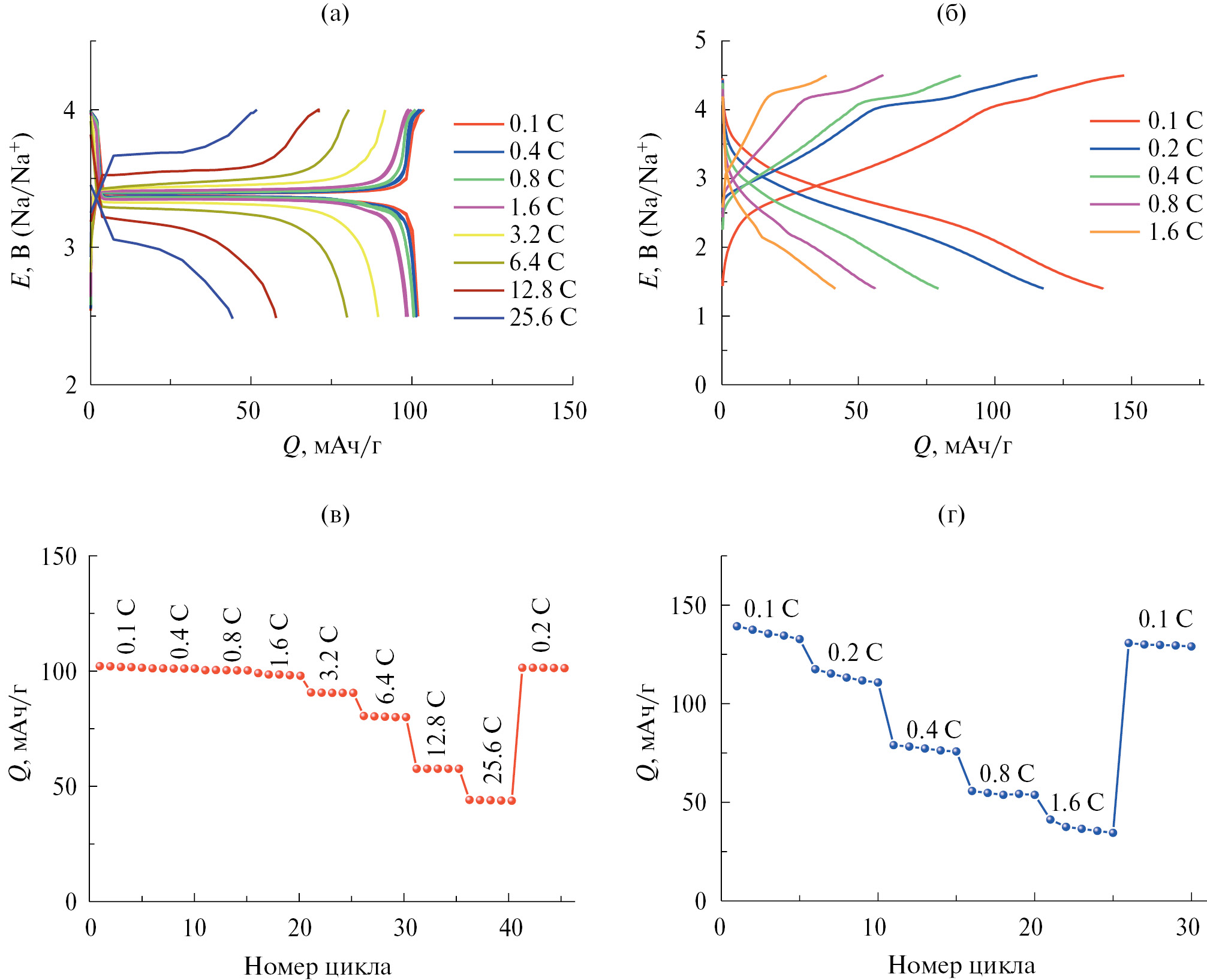 Рис. 1. Зарядно-разрядные кривые (а, б) и зависимость разрядной емкости от плотности тока (в, г) различных катодных материалов: Na3V1.9Fe0.1(PO4)3 (а, в), NaFe0.5Mn0.5PO4 (б, г). Режимы циклирования указаны на рисунках